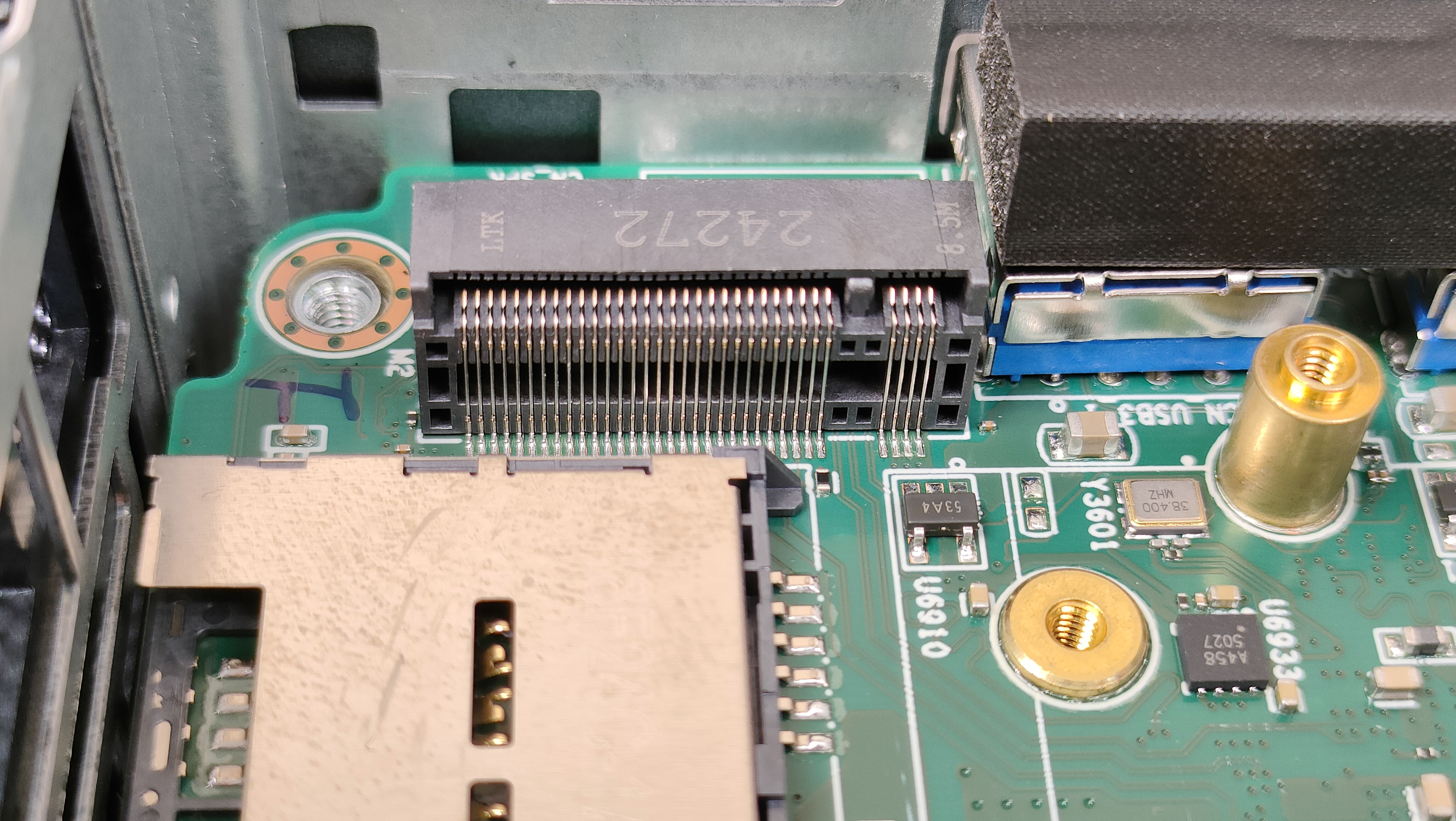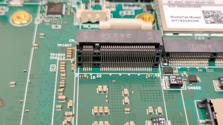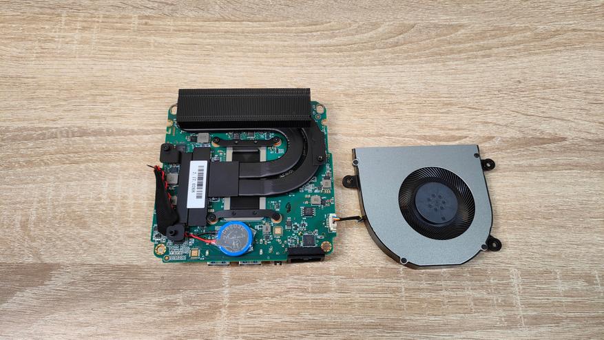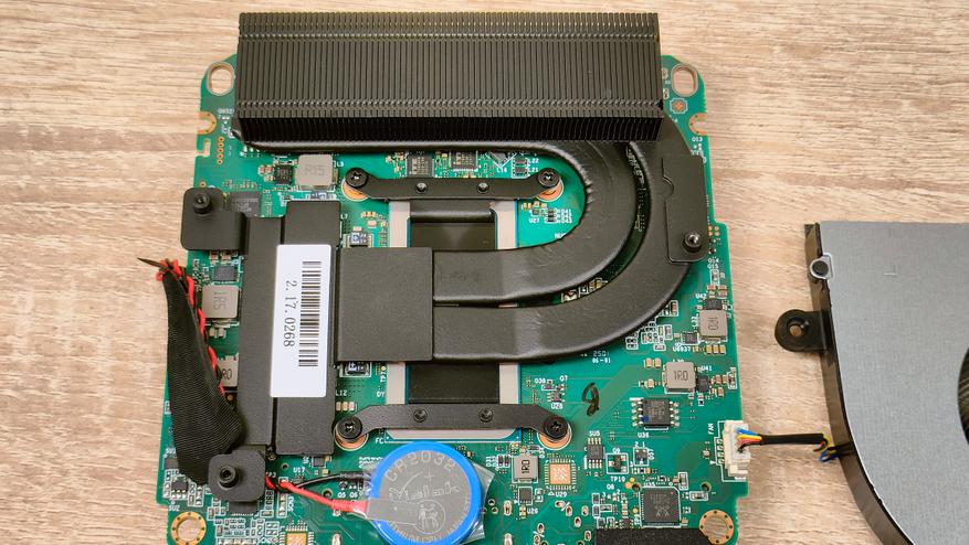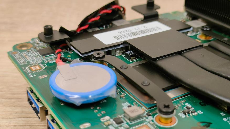 Внутри компоновка примерно такая же, как у большинства мини-компьютеров, в данном случае добавлю только лишь то, что есть второй слот М2 с интерфейсом SATA, что видно по контактной группе, которую я сфотографировал дополнительно. Подсистема питания по традиции находится в одном контуре охлаждения с центральным процессором, это, скорее, плюс, хотя в стрессе даже не знаю стоит ли объединять их в один контур.