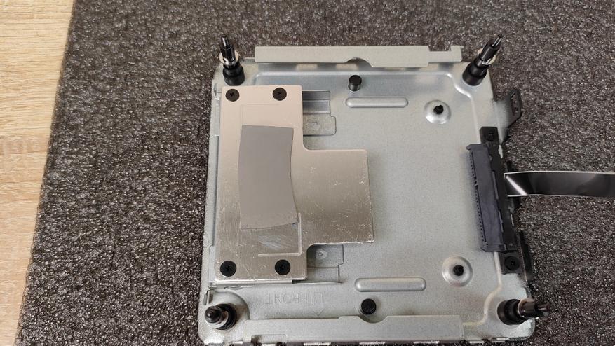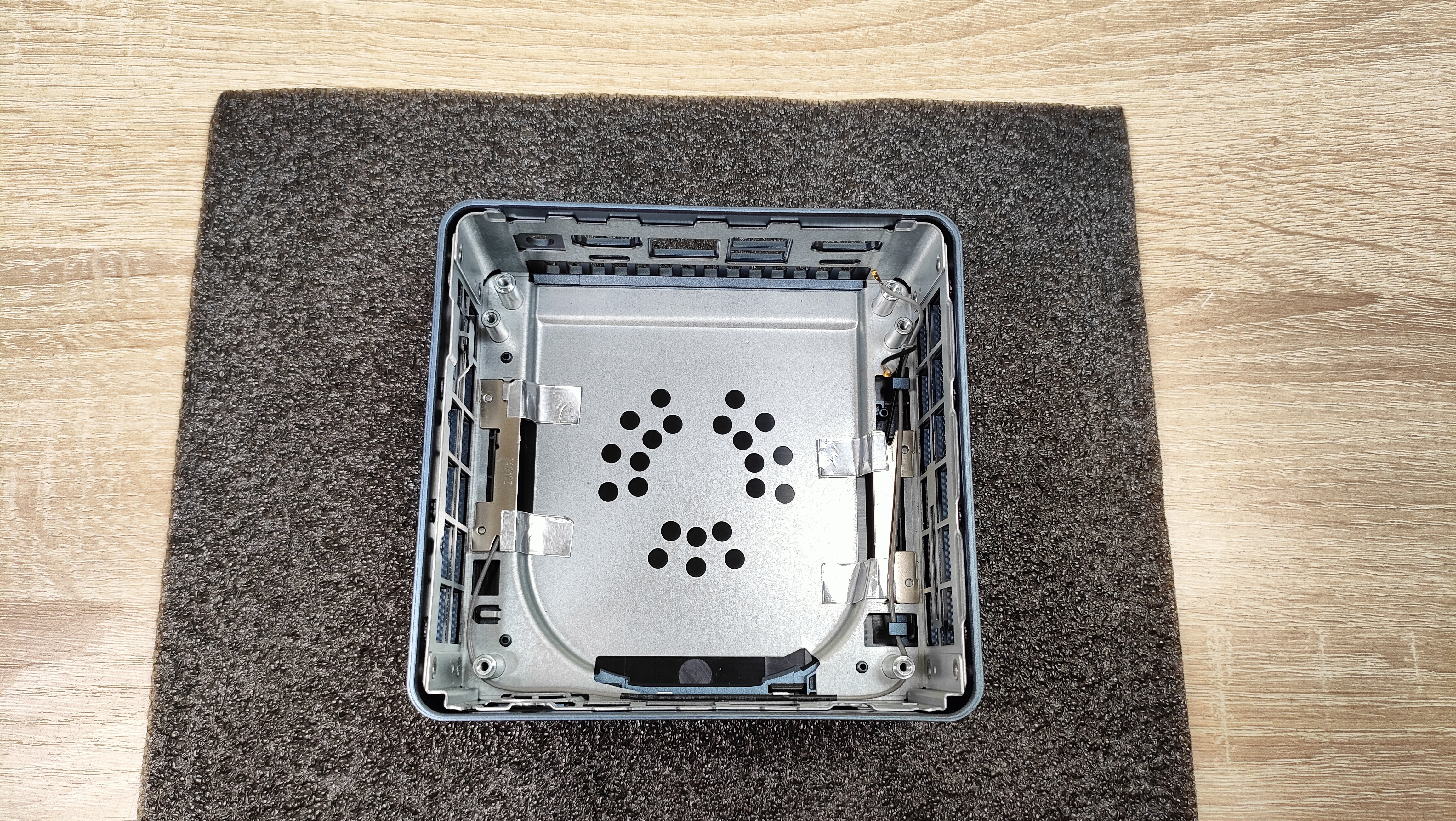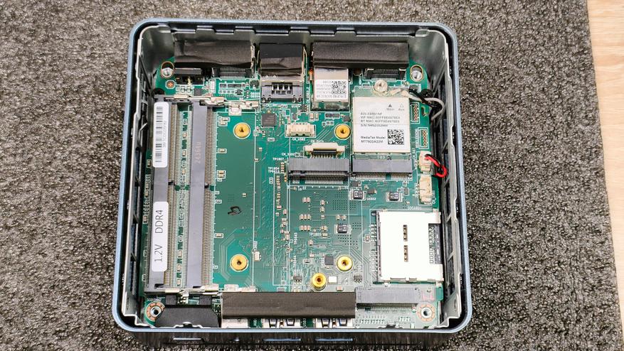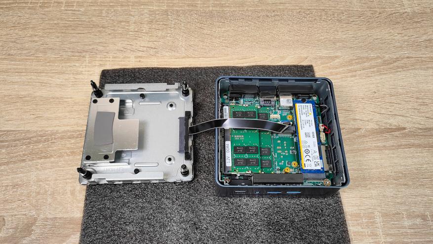 Разборка данного мини-ПК у меня производилась уже неоднократно, тем более, данный корпус встречается и в других миниках данного бренда, поэтому, этот процесс не составляет никакого труда. Выкручиваем винты, которые находятся в силиконовых ножках и снимаем крышку, но делаем это очень аккуратно, так как на ней находится разъём SATA и шлейфом идёт к материнской плате.