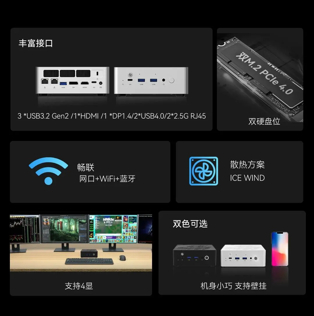Аппаратная платформа M234 включает поддержку оперативной памяти стандарта DDR5 и предусматривает установку двух твердотельных накопителей формата M.2 с интерфейсом PCIe 4.0. Для отвода тепла инженеры JWIPC разработали фирменную систему охлаждения под названием ICE WIND, размещённую внутри корпуса устройства. Беспроводной модуль связи входит в базовую комплектацию мини-ПК.