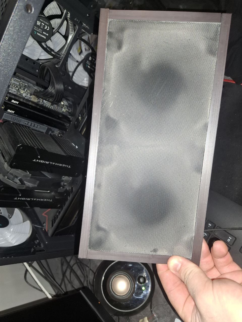 Сетка хуже справляется с пылью, чем поролон: она пропускает мелкодисперсные частицы, накапливающиеся в углах, на ламелях радиаторов и лопастях вентиляторов. При этом материал почти не ограничивает воздушный поток, а значит, не снижает эффективность системы охлаждения.