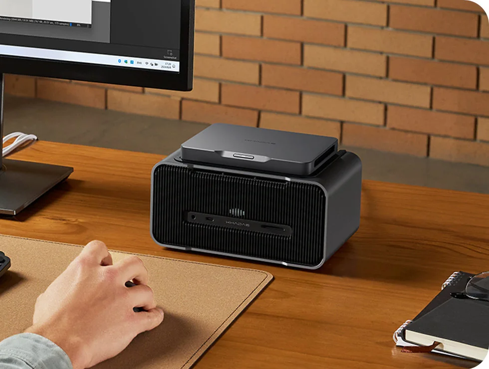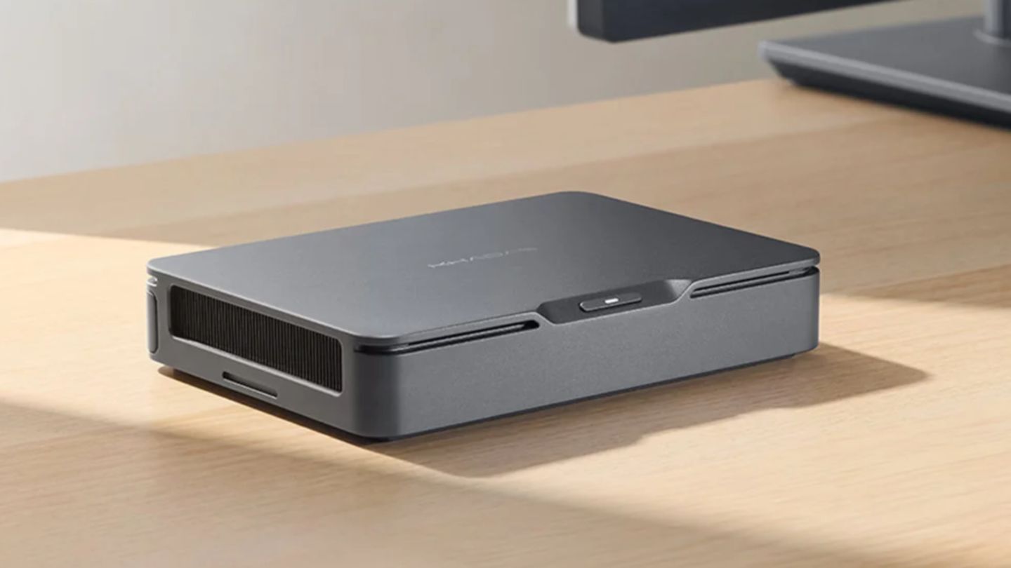 Графическая станция Mind Graphics 2 оснащена дискретной видеокартой NVIDIA GeForce RTX 5060 Ti с 16 ГБ видеопамяти стандарта GDDR7. Устройство объемом 2,5 литра имеет встроенный блок питания на 350 Вт и обеспечивает лимит мощности GPU до 180 Вт. Соединение с мини-ПК осуществляется через фирменный интерфейс Mind Link (PCIe 4.0 x8). Док-станция также выполняет роль хаба и мультимедийного центра: она оснащена портами USB4 (40 Гбит/с), HDMI 2.1b, DisplayPort 2.1b, 2.5GbE-адаптером, слотом для карт памяти SD UHS-II, а также встроенными динамиками, микрофонами и сканером отпечатков пальцев.