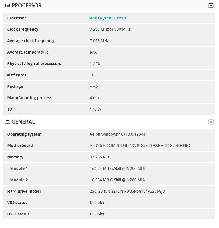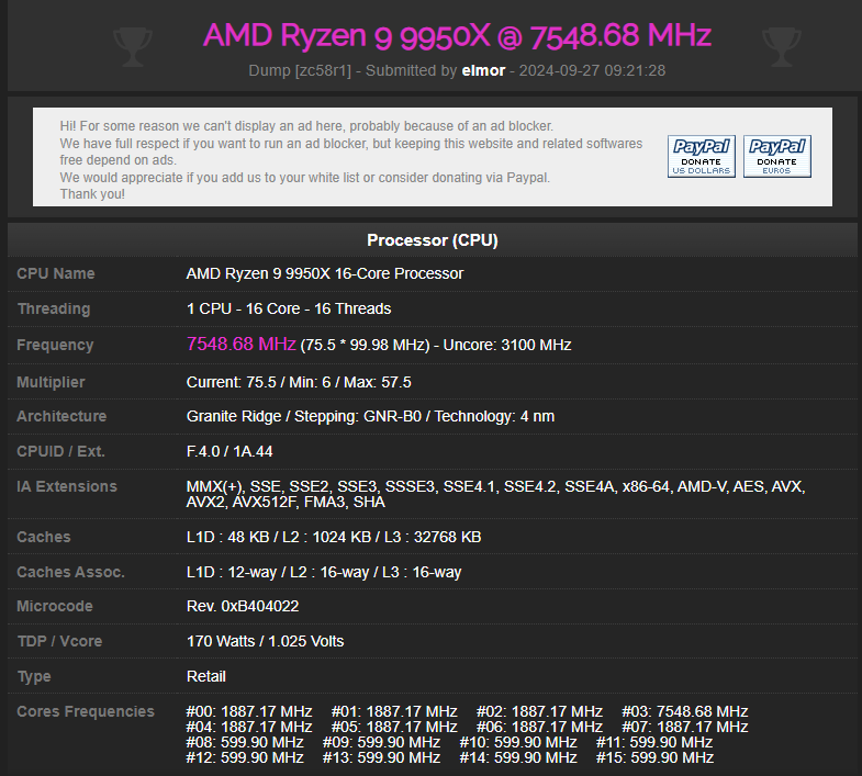 Своими результатами разгона Asus сделала Ryzen 9 9950X в связке с материнской платой ROG series X870E самым быстрым процессором AMD на сегодняшний день, базовая частота которого 4300 MHz и 5700 MHz в турбо бусте. Используя жидкий азот в качестве охладителя удалось достичь частоты процессора в 7548.68 MHz.