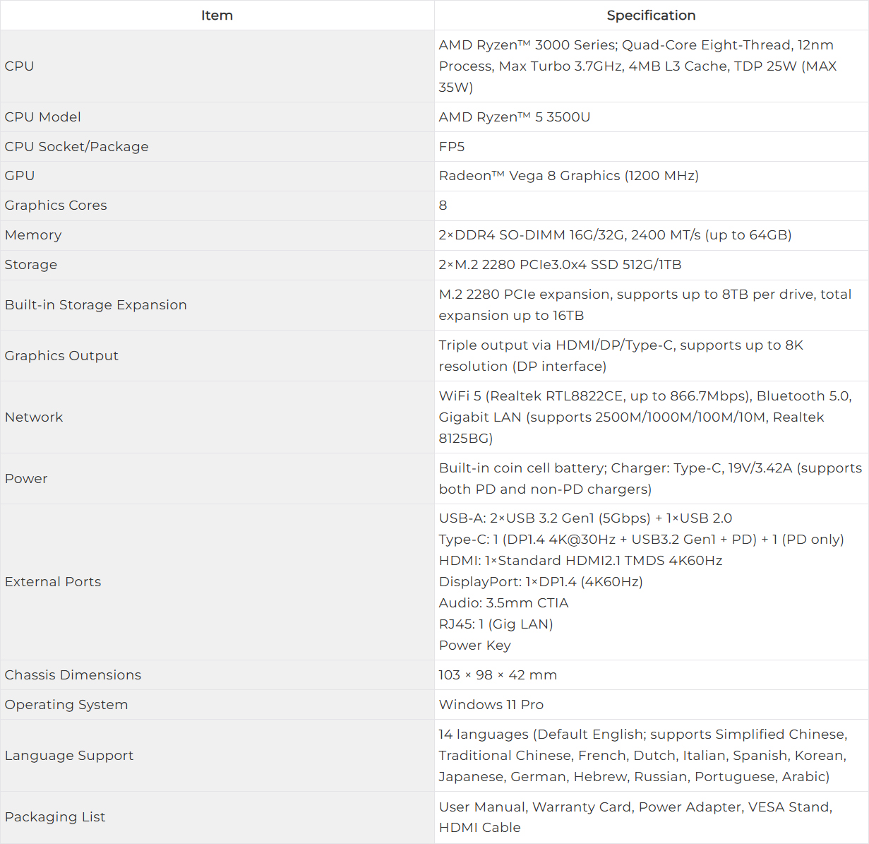 Компания также отмечает, что G10 оснащен вентилятором в сочетании с радиатором. По их утверждению, это помогает системе поддерживать оптимальную температуру даже при высоких нагрузках, сохраняя при этом низкий уровень шума. NucBox G10 также обладает хорошим набором портов, включая: 2x USB 3.2 Type-A, 1 полнофункциональный USB Type-C, 1x USB Type-C с поддержкой PD, 1x USB 2.0 Type-A, 1x 2.5G Ethernet, 1x HDMI 2.1 и 1x DisplayPort 1.4. Для беспроводной связи предусмотрены Wi-Fi 5 и Bluetooth 5.0.