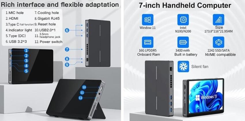 Для подключения внешних мониторов можно использовать USB Type-C, но полноценный порт HDMI отсутствует. Габариты гибридной системы составляют примерно 17,3 x 11,7 см, она оснащена 7-дюймовым сенсорным экраном с разрешением 1280 x 800 пикселей. SZBox остановила свой выбор на процессоре Intel N200, который не отличается высокой производительностью. В спецификациях устройства также указаны 16 ГБ оперативной памяти LPDDR5 и твердотельный накопитель M.2 2242 емкостью 512 ГБ. Также этот необычный планшет или мини-ПК имеет встроенный аккумулятор емкостью 3400 мАч.