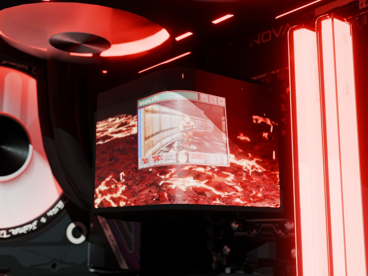 Основной особенностью сборки стала система жидкостного охлаждения TRYX Panorama SE 360 AiO. Радиатор диаметром 360 миллиметров оснастили дисплеем, который непрерывно воспроизводит игровой процесс классической DOOM. Три вентилятора обеспечивают охлаждение компонентов при низком уровне шума. Экран виден через прозрачную боковую панель корпуса.
