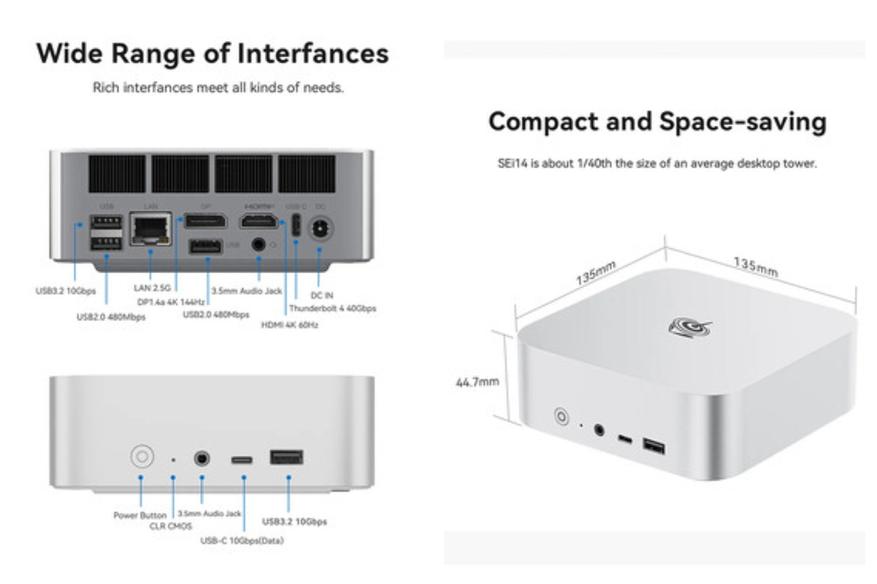 Особенности Beelink SEI14 включают в себя большое количество портов, в том числе порт Thunderbolt 4 со скоростью 40 Гбит/с, который поддерживает eGPU. Также есть в наличии порты USB Type-C (10 Гбит/с), USB 3.2 (10 Гбит/с), DisplayPort 1.4a и HDMI для подключения различных устройств.