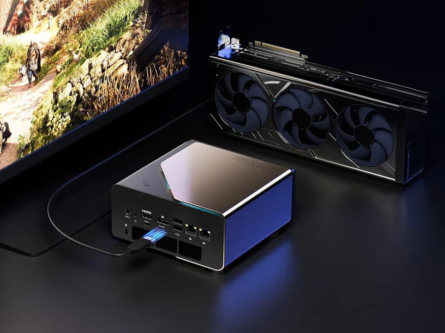 Для хранения данных EVO-T1 предлагает три слота PCIe 4.0x4, обеспечивающих возможность установки накопителей общей емкостью до 8 ТБ. Мини-ПК также обладает широким набором портов, включающим: HDMI 2.1 (1 шт.), DisplayPort 1.4 (1 шт.), USB 2.0 Type-A (2 шт.), USB 3.2 Gen2 Type-C (1 шт.), USB 3.2 Gen2 Type-A (3 шт.), USB4 (1 шт.), 2.5G Ethernet (2 шт.) и OCuLink (1 шт.). Наличие USB4 и OCuLink значительно расширяет возможности подключения внешних видеокарт (eGPU).