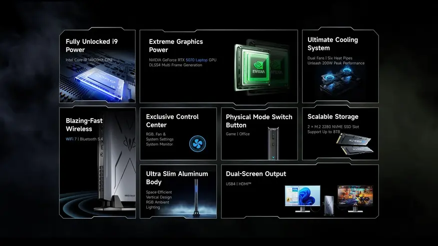 Техническая часть базируется на процессоре Intel Core i9-14900HX (24 ядра, 32 потока) с максимальной частотой до 5,8 ГГц. За графику отвечает дискретная видеокарта Nvidia GeForce RTX 5070 для ноутбуков — это единственный доступный вариант GPU для данной конфигурации. Для отвода тепла используется система из шести тепловых трубок, двух турбовентиляторов типоразмера 8015 мм и трехстороннего выхлопа.