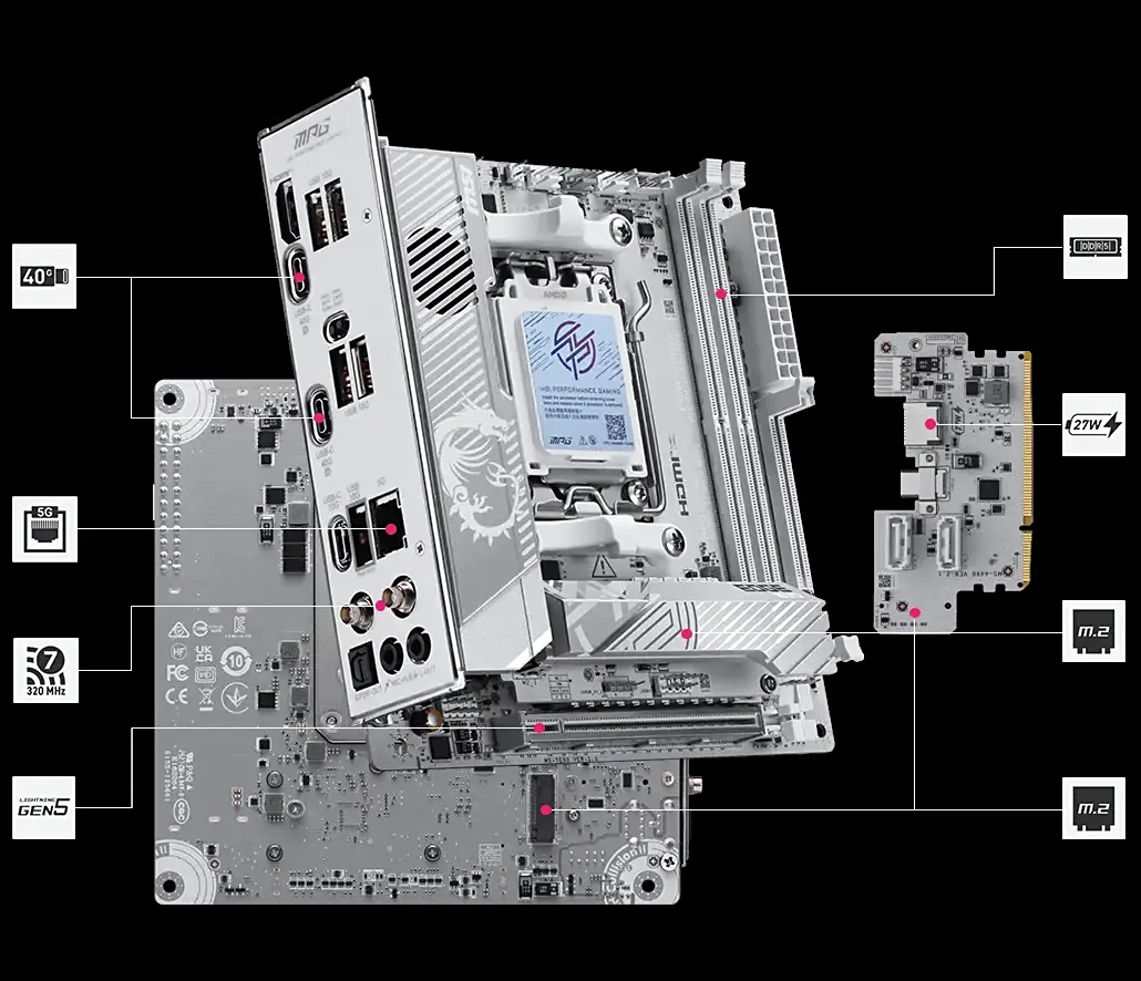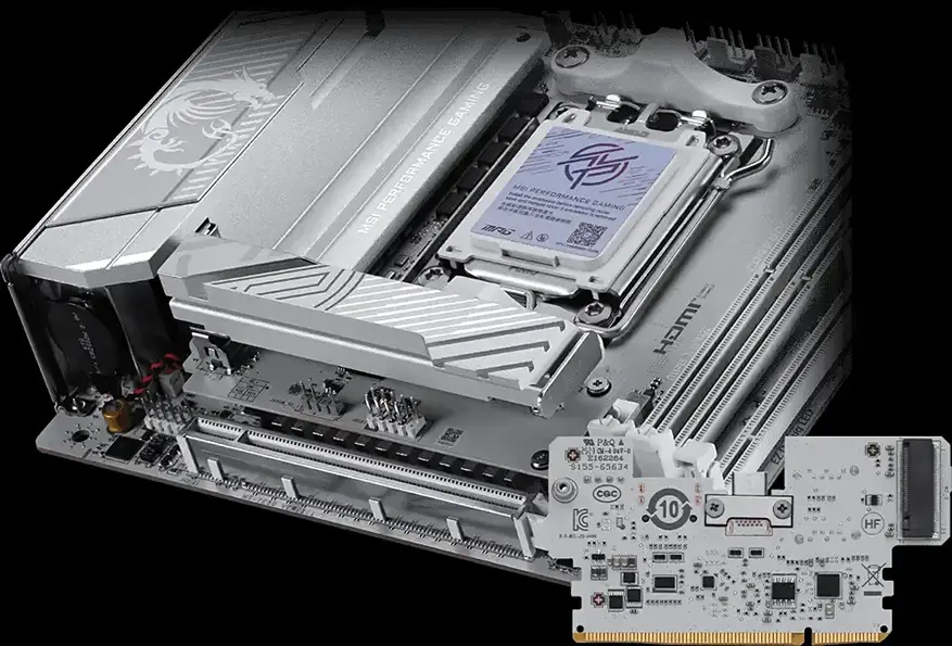 Особенностью конструкции стала поддержка оперативной памяти DDR5 с частотой свыше 10000 МТ/с при активации режима разгона. Производитель реализовал модульную архитектуру с использованием дочерних плат для расширения функциональности в условиях ограниченного пространства Mini-ITX.