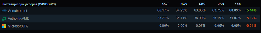 Также шестиядерники смогли закрепиться и обратно заполучить почти 4% аудитории (с 31,8% до 35,11%), которые большей частью были потеряны пользователями четырёхядерных ЦП. Также значительный рост показали процессоры с 10 ядрами, и несколько менее значимый рост у других конфигураций процессоров синей компании, что в совокупности объясняет резкий рост доли процессоров Intel: с 64,23% до 68,86% (+4,63% за три месяца).