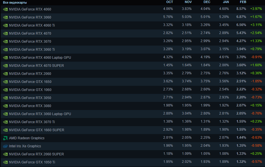 Рынок графических ускорителей также не устоял перед множеством китайских игроков, в результате чего топ-5 самых популярных карт существенно изменился. Так, первое место досталось RTX 4060, которая только за один месяц прибавила 3,97%, а за три месяца — +4,74%. Бывший лидер, RTX 3060, хоть и прибавил за три месяца 1,84%, всё же сместился на второе место. После этого следуют ещё три карты, которые относятся к средне-высокому сегменту поколений Ampere и Ada Lovelace, которые также резко нарастили свою популярность в последний месяц. Остальные видеокарты сохранили примерно адекватные числа, которые сопоставимы со значениями прошлых месяцев, но всё равно их доли подверглись корректировке из-за аномально высоких значений у самых популярных решений.