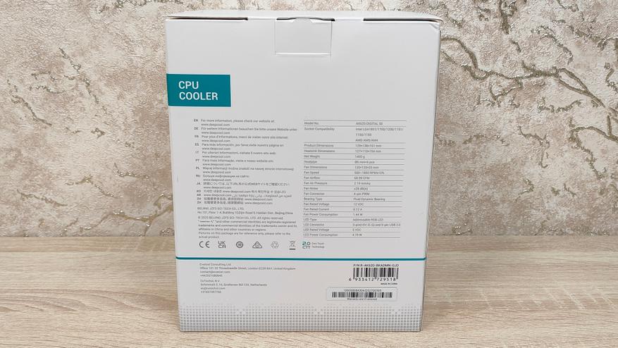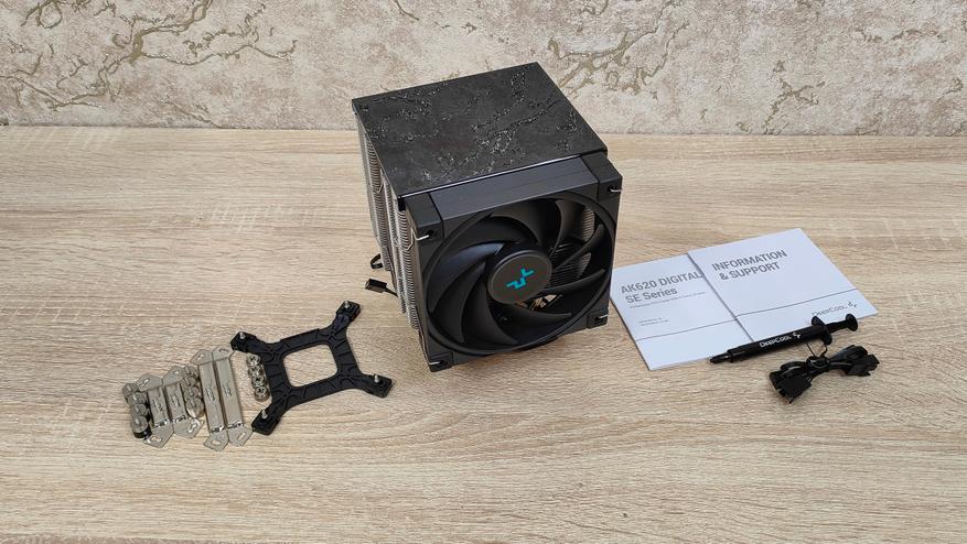 Как и раньше, на коробке есть много технической информации в виде подробной таблицы с характеристиками. Не забыт и внешний вид системы охлаждения. Комплект поставки типичен для воздушного кулера для ЦП: система охлаждения AK620 DIGITAL SE в сборе, крепёжный набор для AMD, крепёжный набор с бэкплейтом для Intel, Y-образный коннектор для подключения вентиляторов, руководство пользователя, шприц с термопастой.