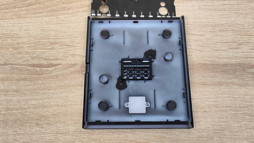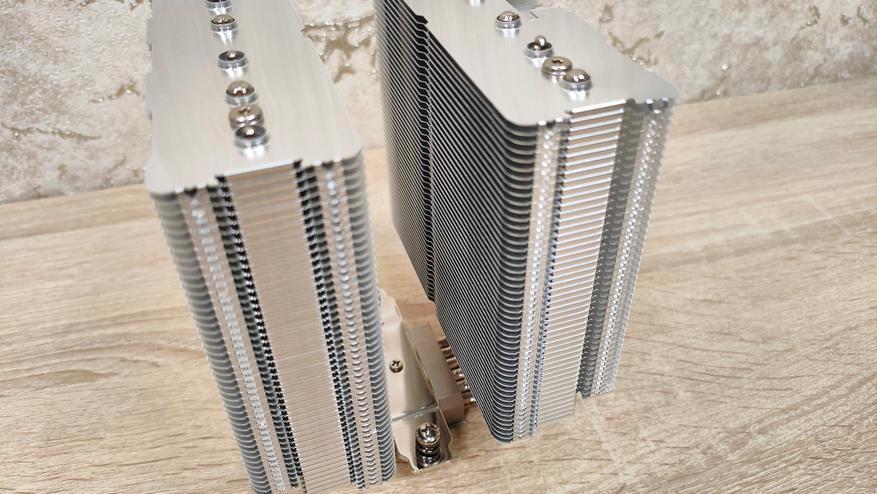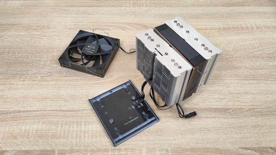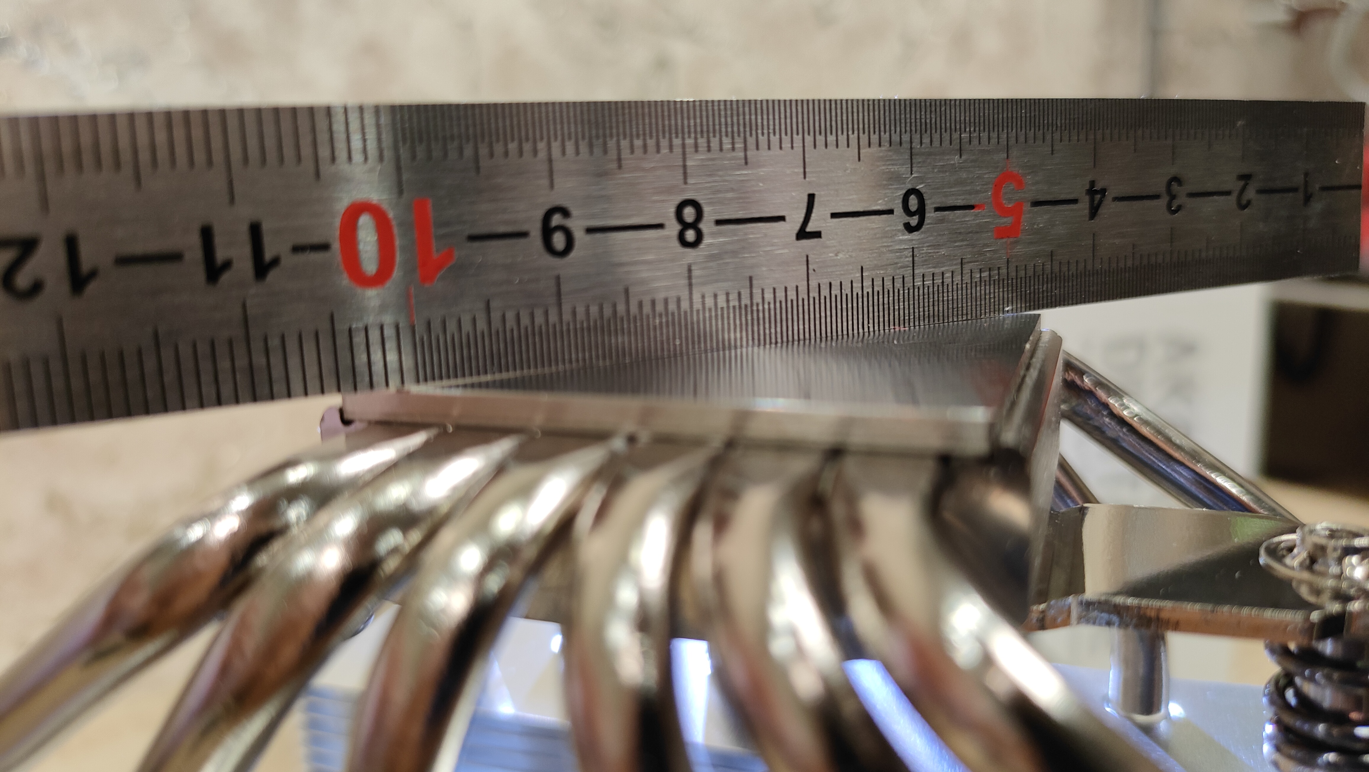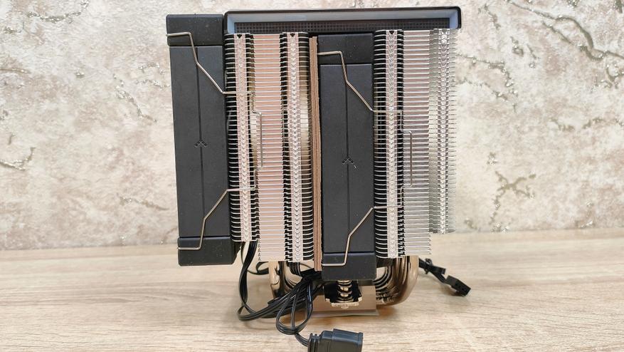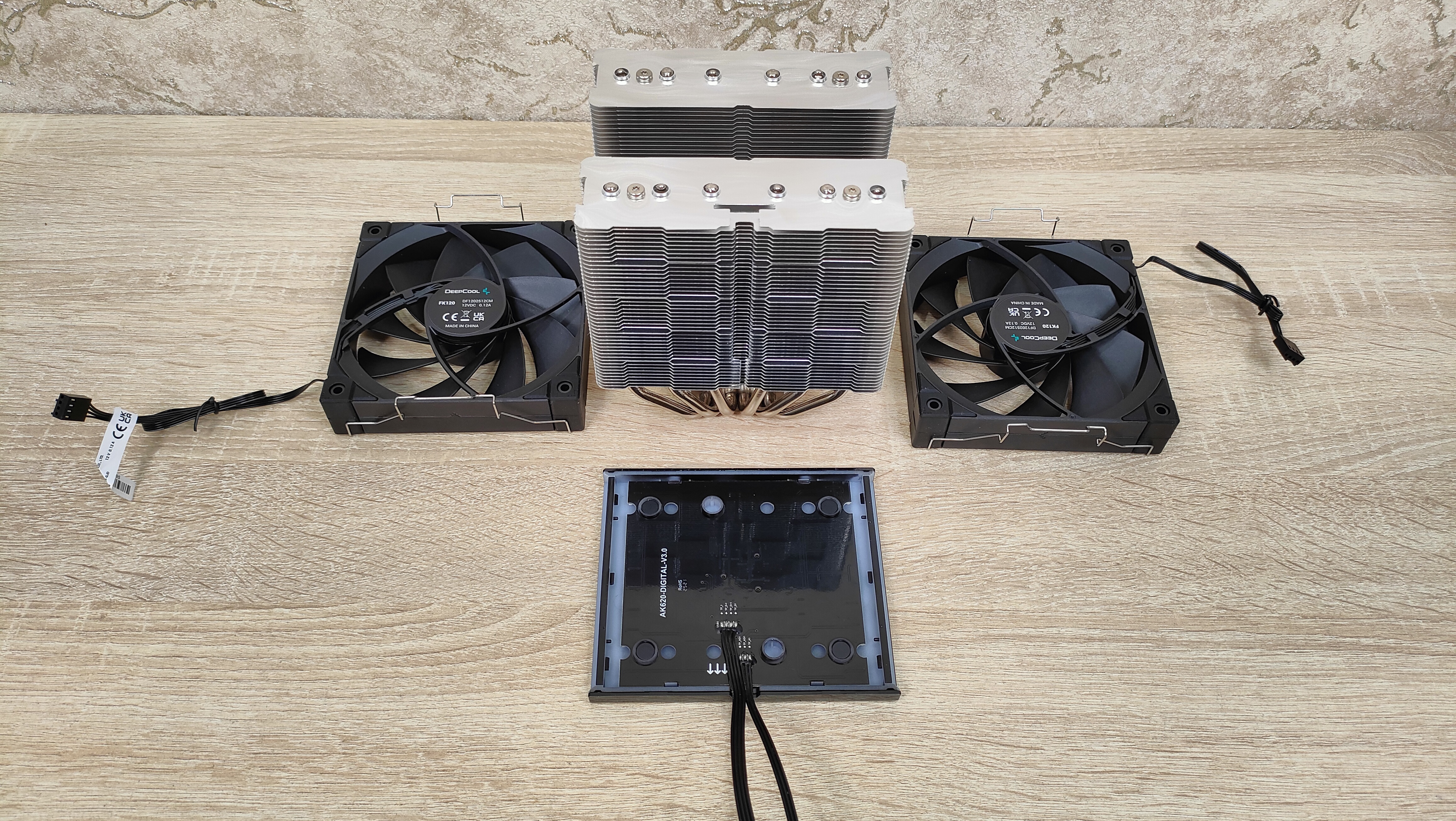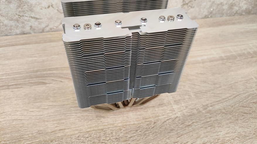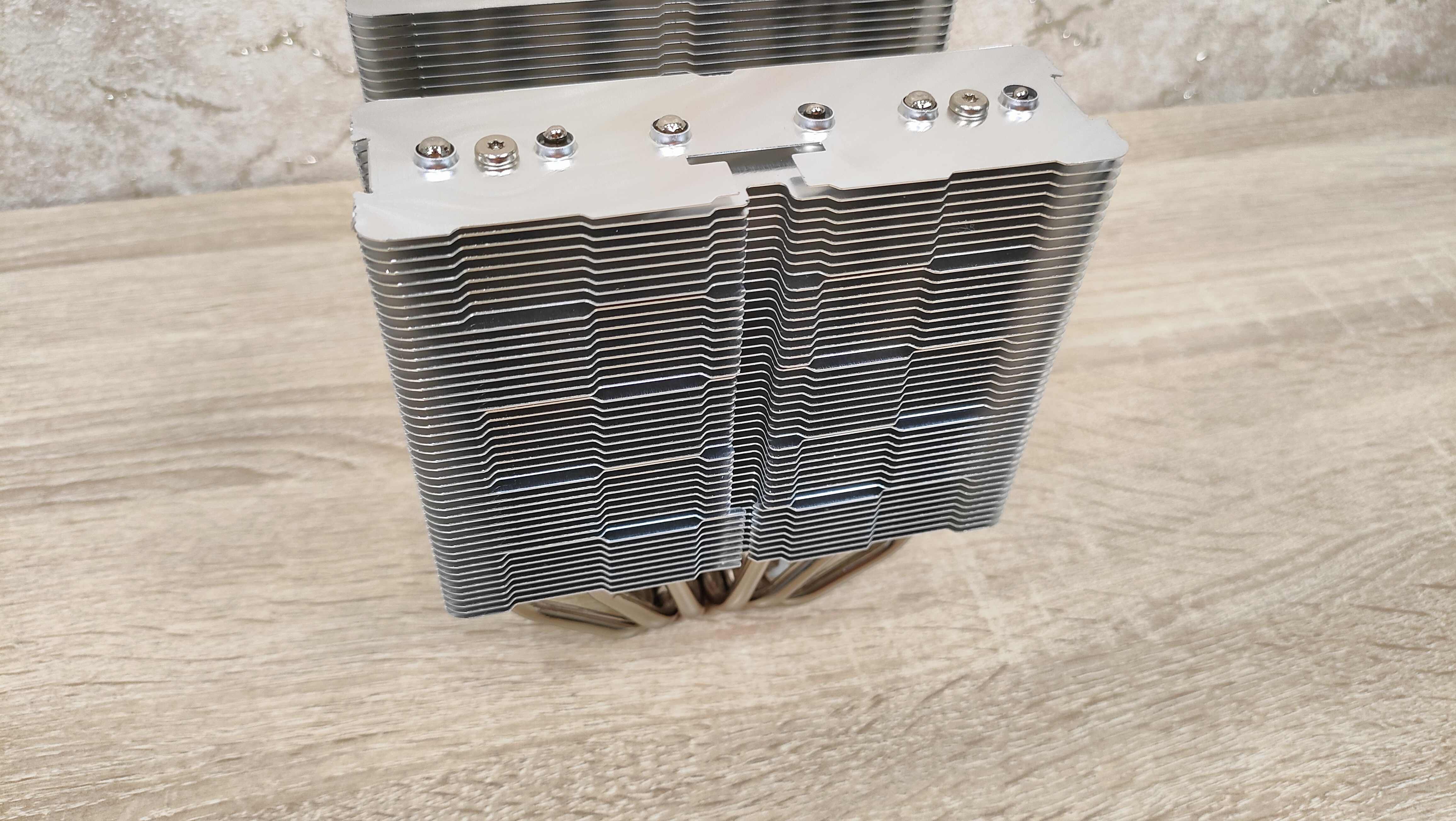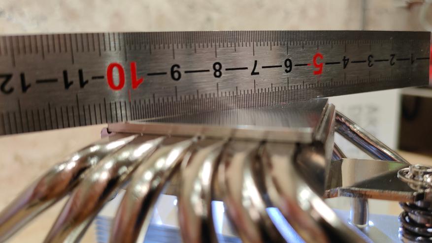 Сняв лишний обвес, можно заметить, что секции практически идентичны, за исключением мелких деталей, вроде кабель-канала для экрана. Поворачивая радиатор трижды и прикладывая линейку выяснил, что в центре есть совсем небольшая выпуклость. Совсем небольшая, пришлось изрядно попрыгать с линейкой фонарём и камерой, чтобы хоть что-то показать. Экран снимать необходимо в любом случае, поэтому решил снять его заранее и разобрать, заодно посмотреть, что там да как, но ничего особого интересного не увидел, обычная плата, со светодиодами-сегментами. В данной версии кулера установлены те же вентиляторы FK120, что были и в первой версии AK620. Эта модель уже продаётся в районе 3 лет и вполне неплохо себя зарекомендовала, как «бодрая» комплектная модель.