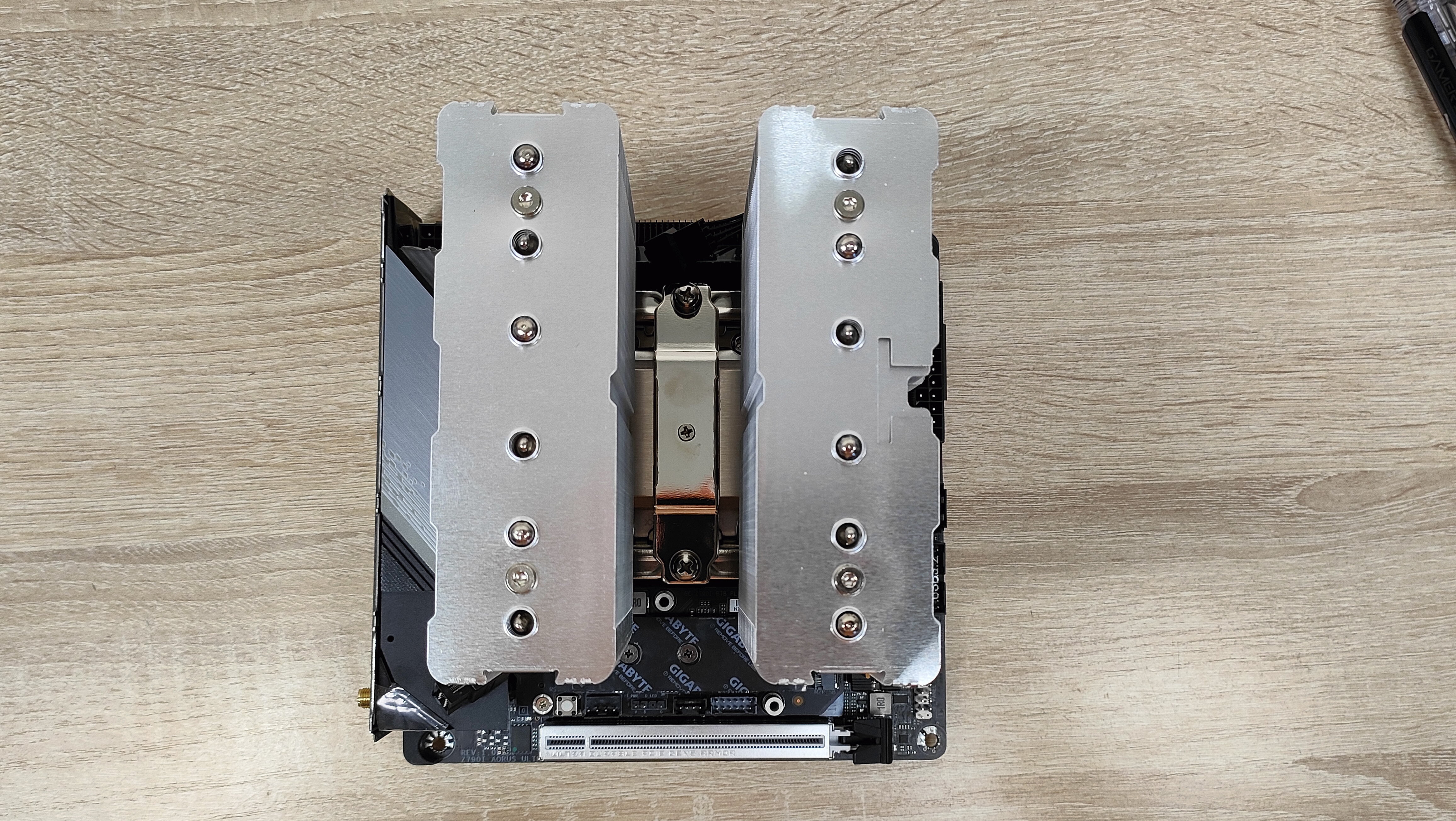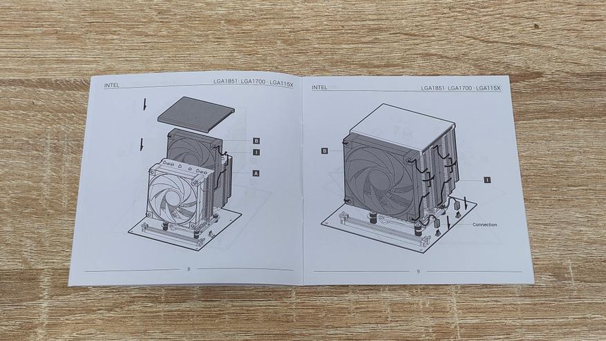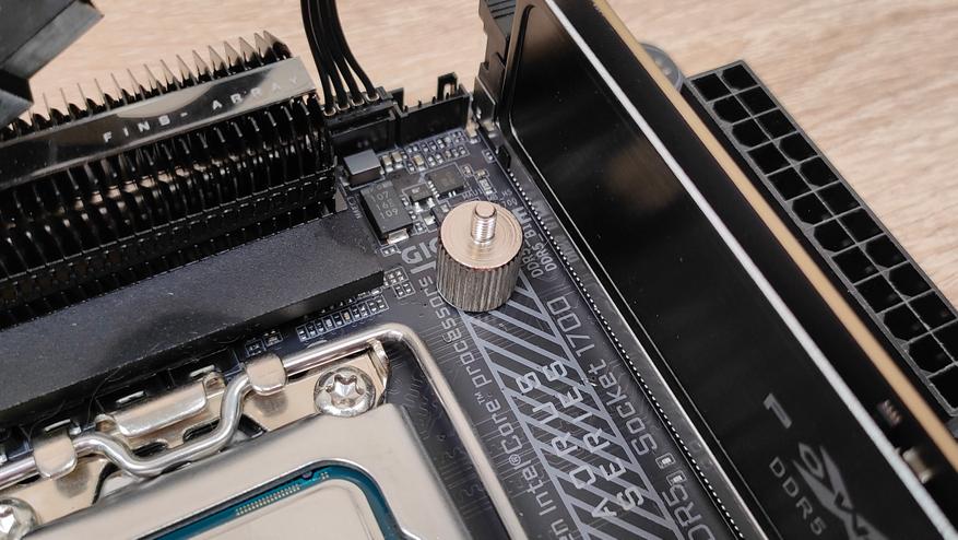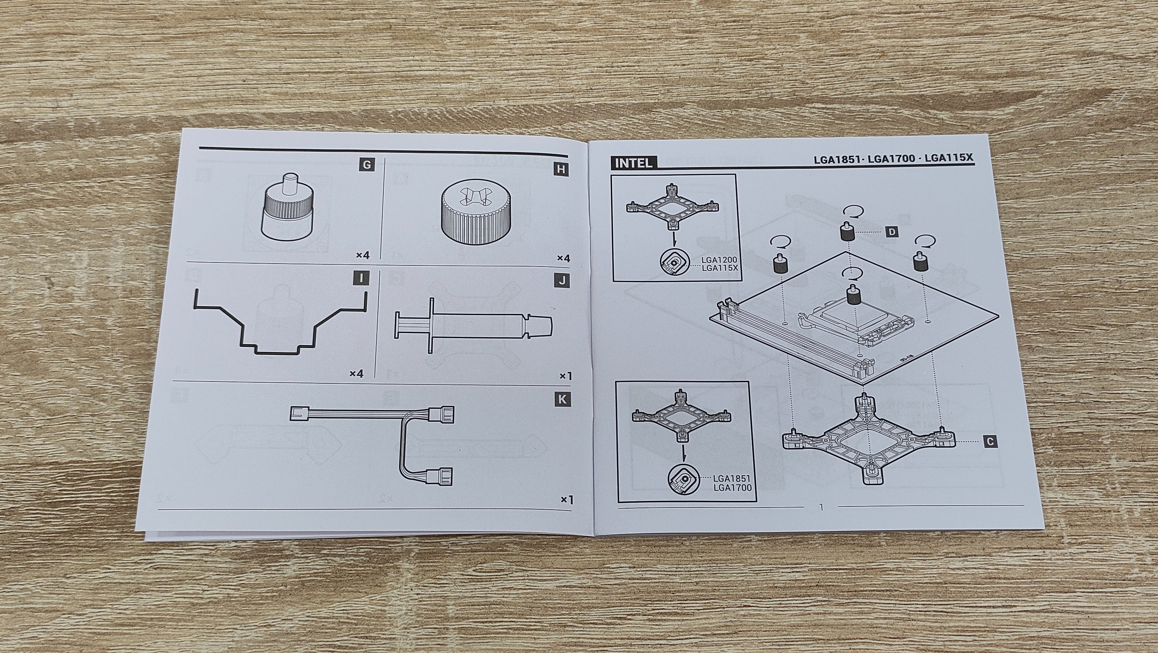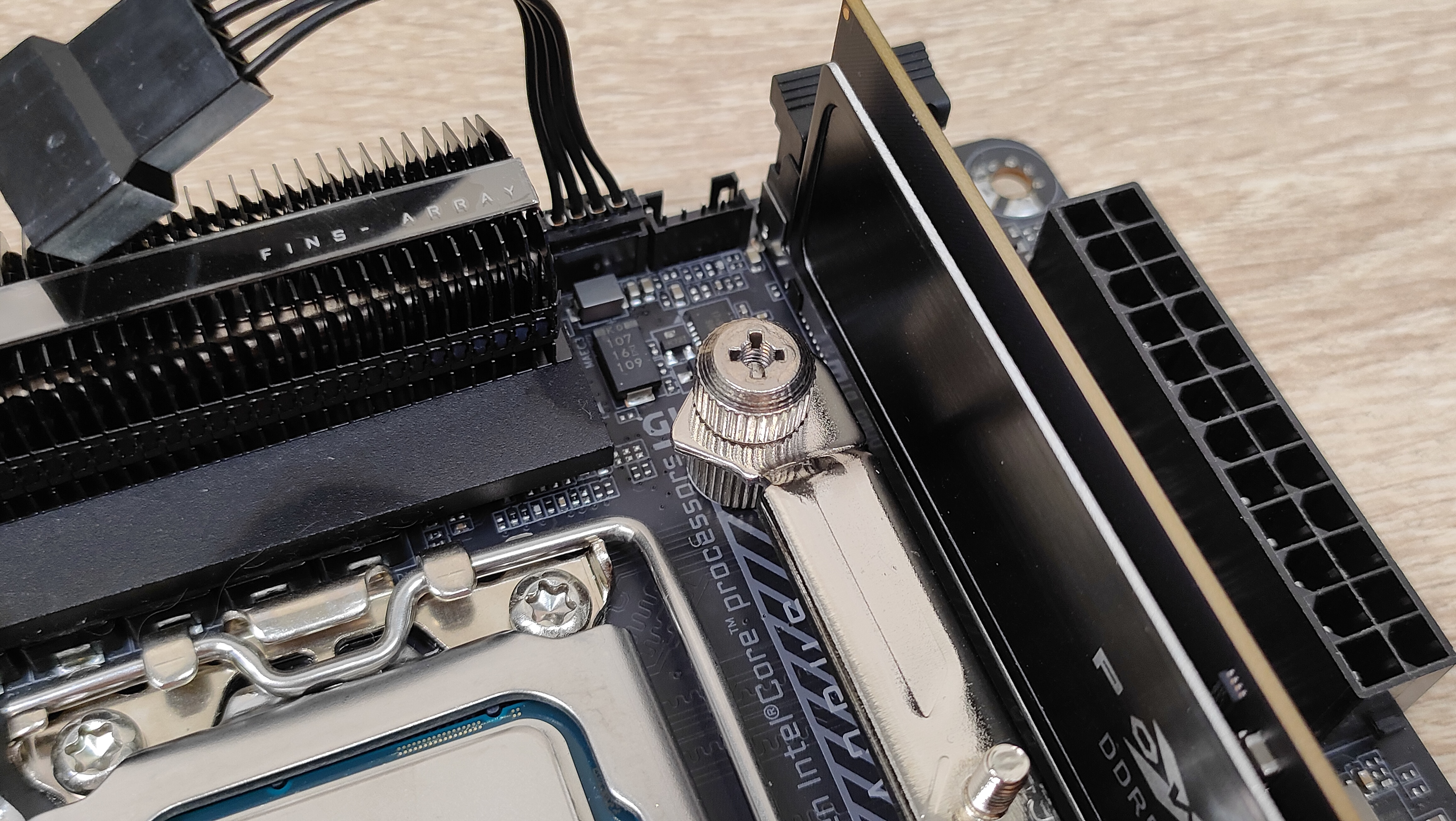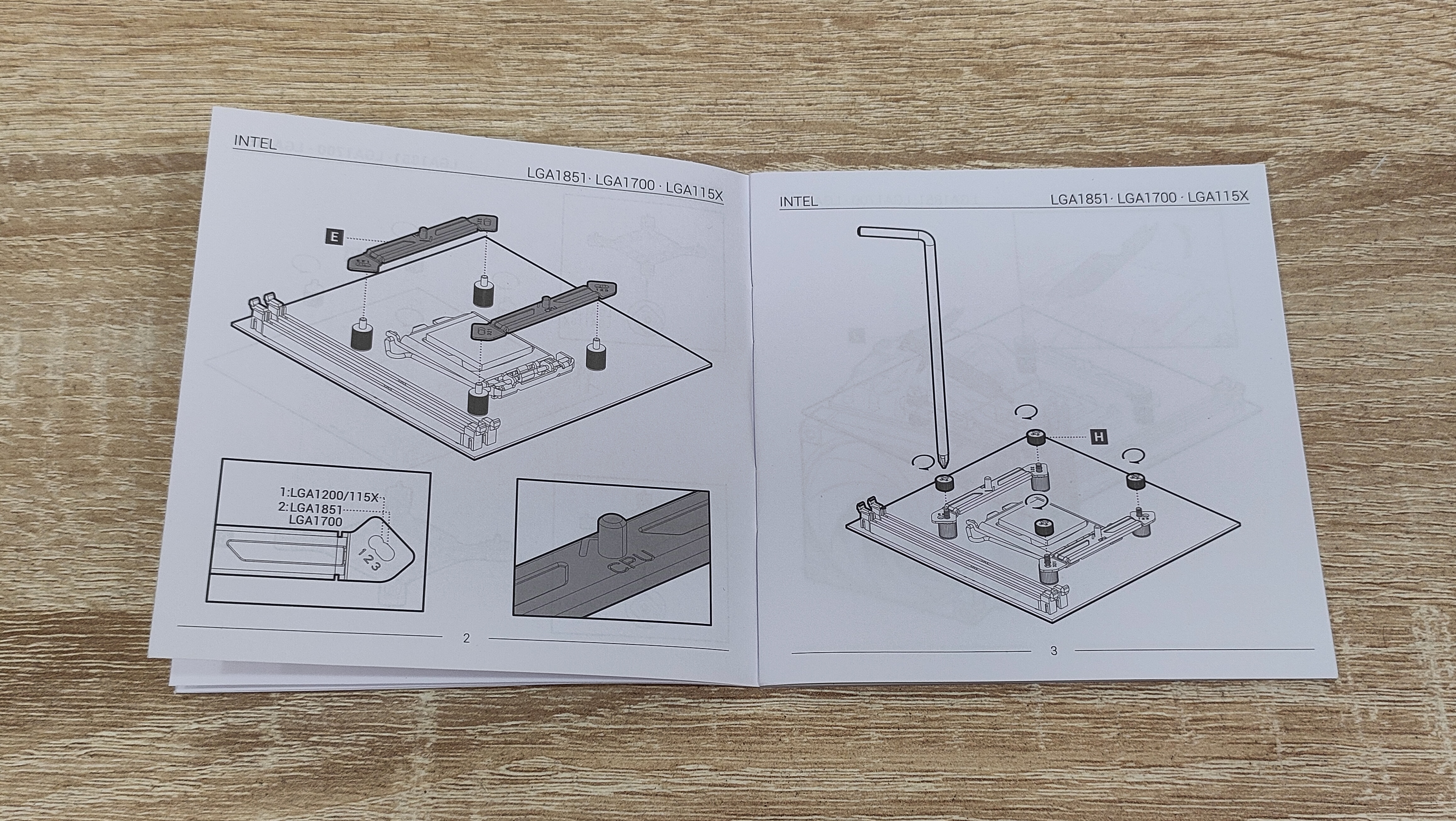 Установка систем охлаждения на платформе Intel, на которой я и буду тестировать данное устройство — простейшая. Необходимо к бэкплейту прикрутить втулки с внешней резьбой, затем прикрутить монтажный комплект для Intel. Далее, следует снять вентиляторы и экран с радиатора и установить его на своё законное место, не забыв снять плёнку с подошвы и нанести термопасту.