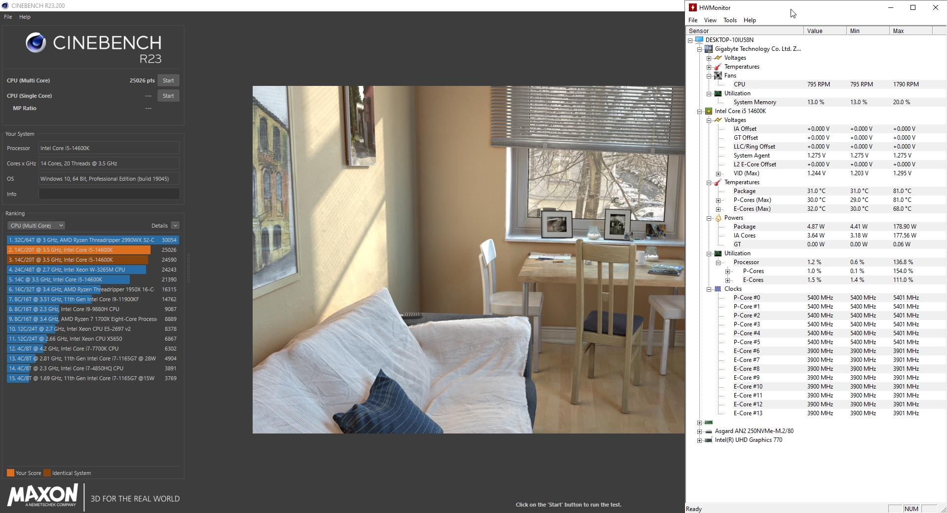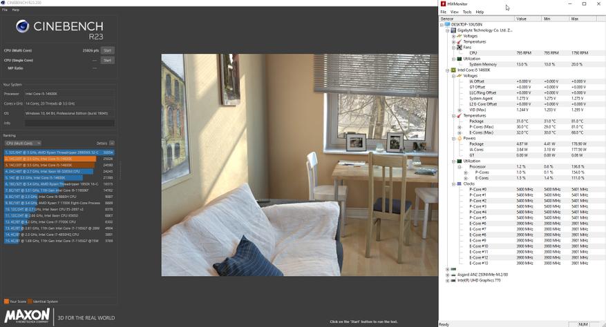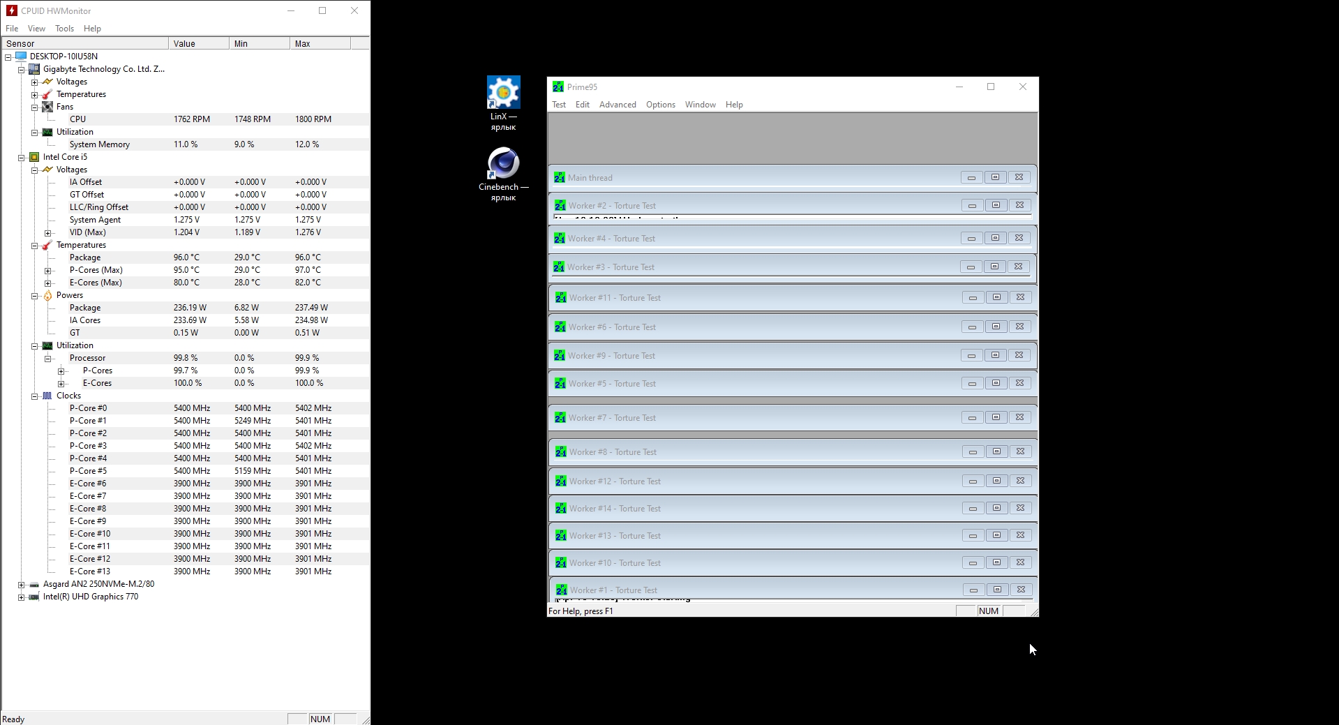 Тестирование будет проходить на процессоре Intel Core i5 14600K, у которого я поднял частоту ядер до 5,4 и 3,9 ГГц для производительных и энергоэффективных ядер соответственно, а также излишне задрал напряжение до 1.24 В, чисто для того, чтобы потребление и нагрев процессора возросли, далее установил максимальные обороты у вентиляторов при тестировании в prime95, а при тестировании в Cinebench R23 установил профиль «Silent». Оба теста проходили в течение 10 минут, при температуре окружающей среды 23° по Цельсию.