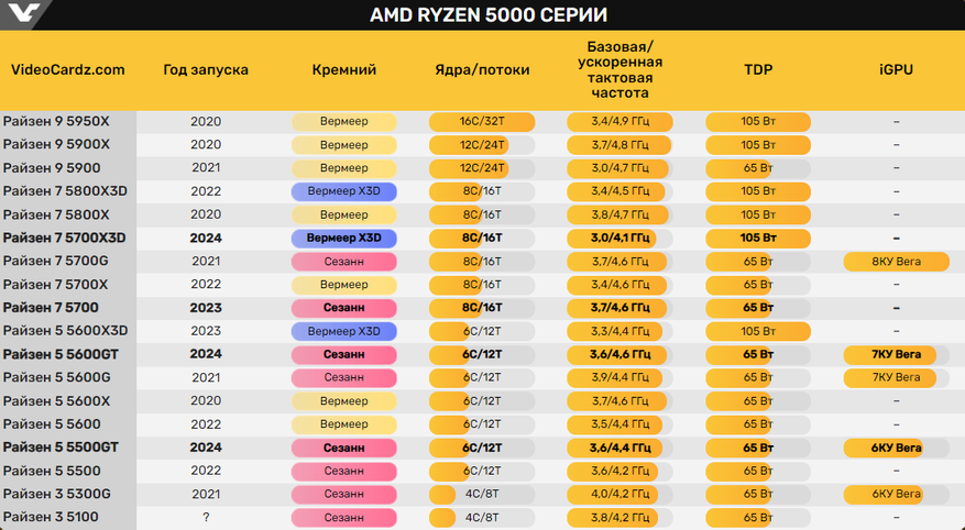 Как сообщается из ранних утечек новыми процессорами для платформы AM4 обещают стать следующие модели: Ryzen 7 5700X3D, Ryzen 7 5700, Ryzen 5 5600GT и Ryzen 5 5500GT.