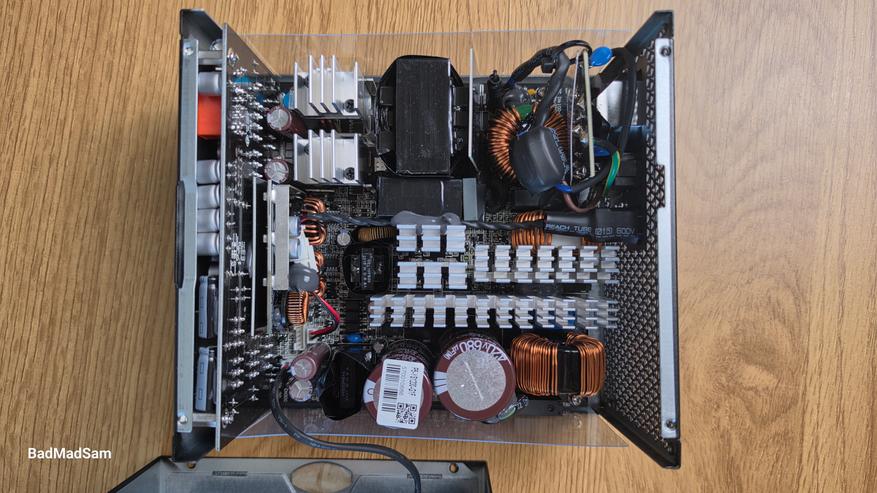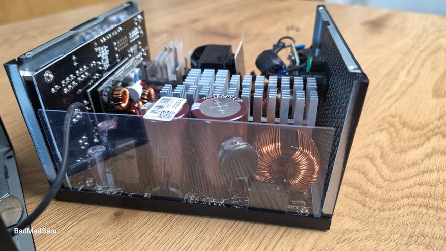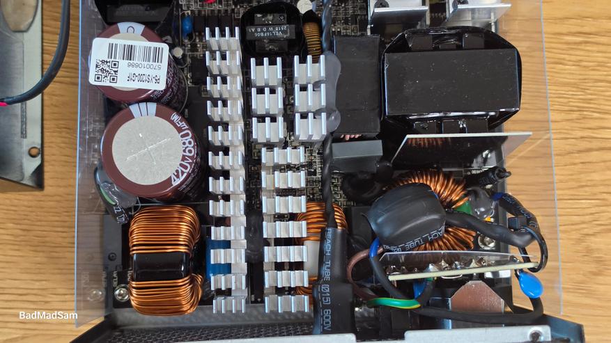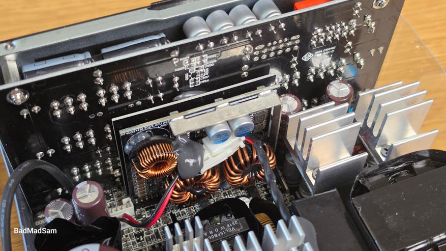 По элементной базе здесь тоже все хорошо. Используются контроллеры Champion в части APFC и LLC, транзисторы Nexperia в силовой зоне, а за контроль и защиту отвечает супервизор Weltrend. DC-DC преобразование реализовано на контроллере Anpec. По конденсаторам используются решения японских производителей. Такой набор сейчас типичен для платформ уровня выше среднего и обычно не встречается в более простых блоках.