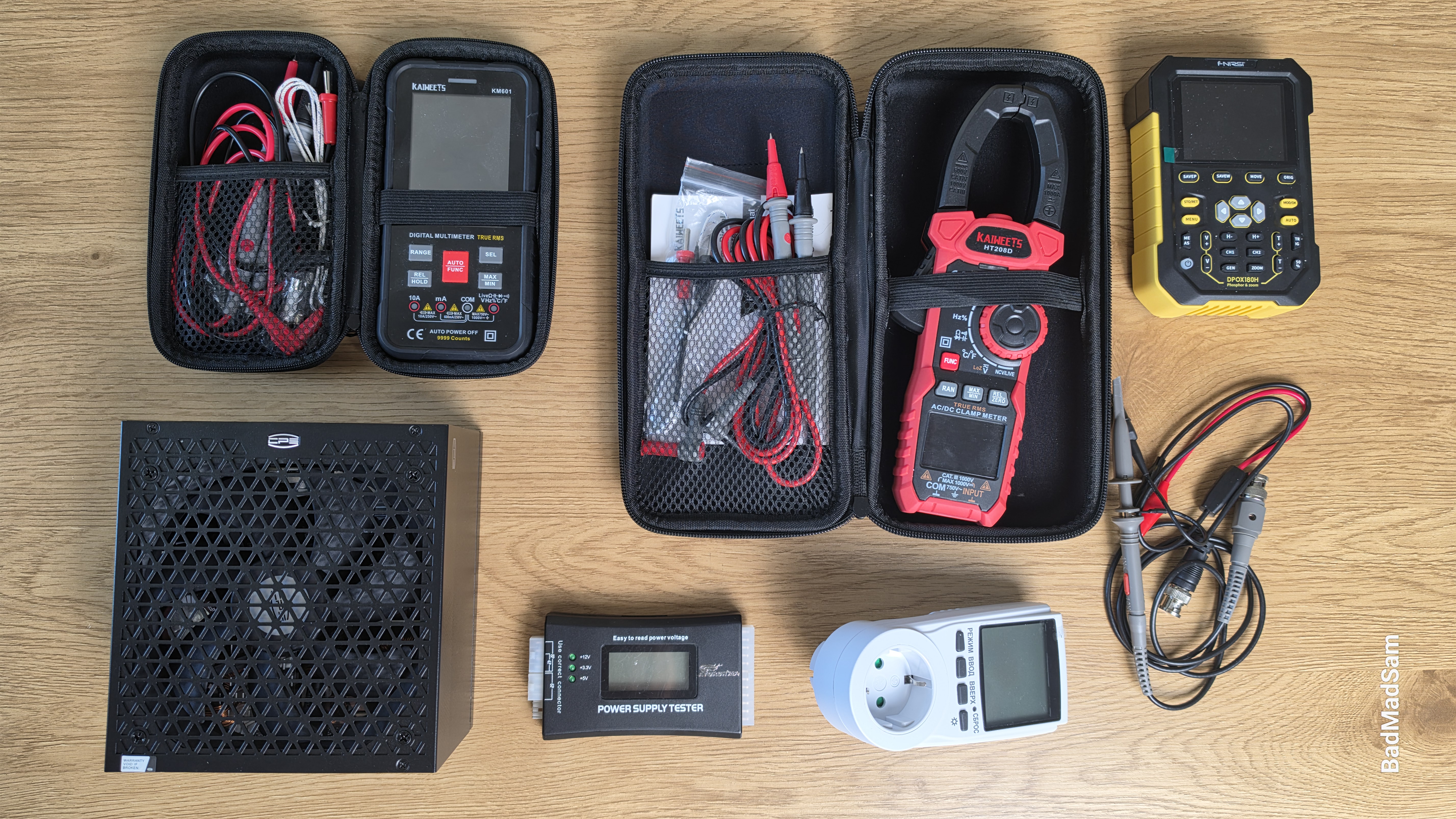 Пульсации проверял осциллографом. Снимал сигнал непосредственно с линий 12 В, 5 В и 3.3 В, по мере увеличения нагрузки. Нагрузку набирал постепенно, распределяя ее по каналам электронных модулей, а малые линии догружал резисторами. Щуп подключал максимально близко к выходу — прямо на разъемах, чтобы не ловить лишние наводки по проводам. Замеры делал в нескольких точках, начиная с небольшой нагрузки и дальше вверх. Отдельно прогнал линию 5VSB.