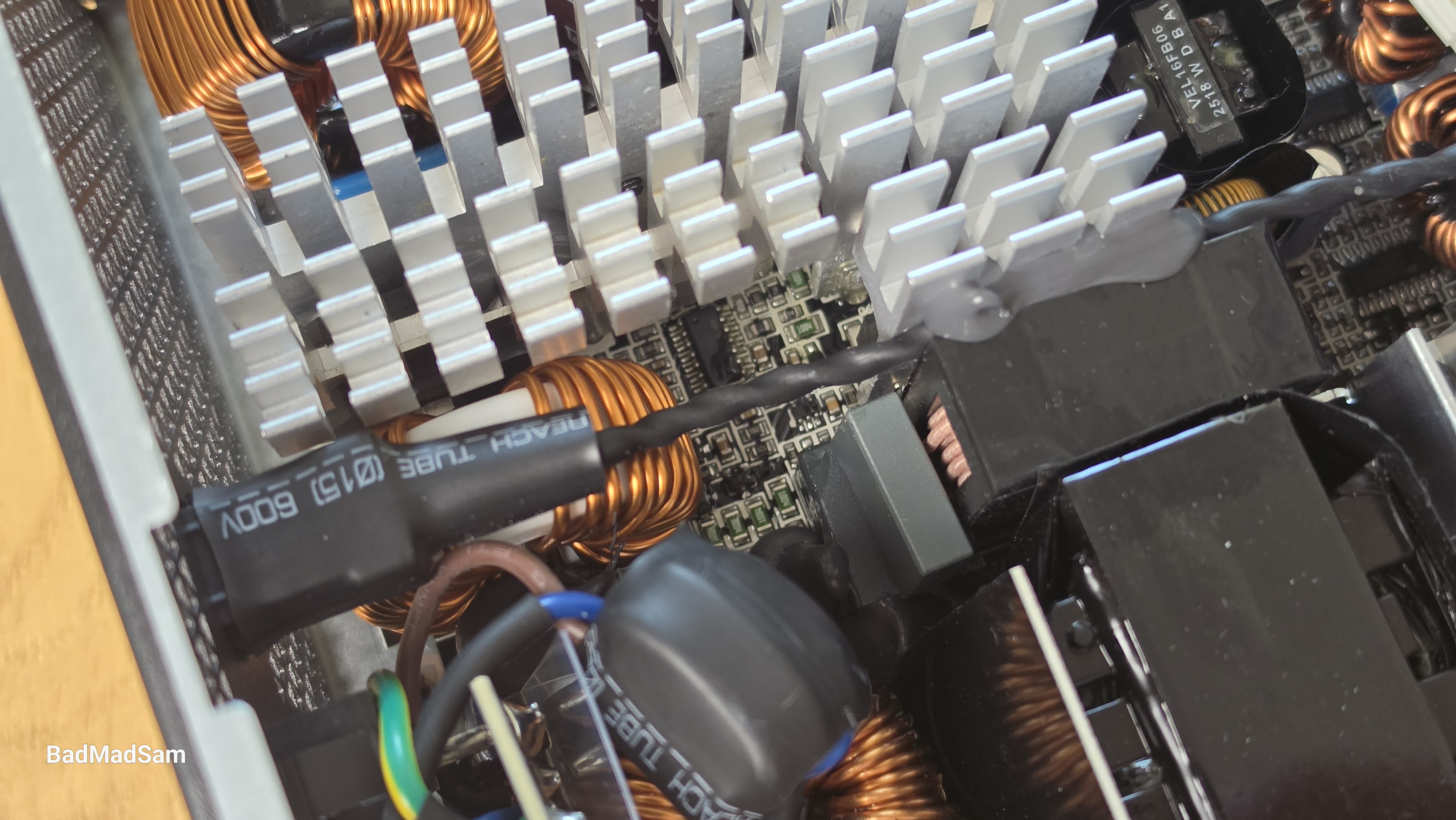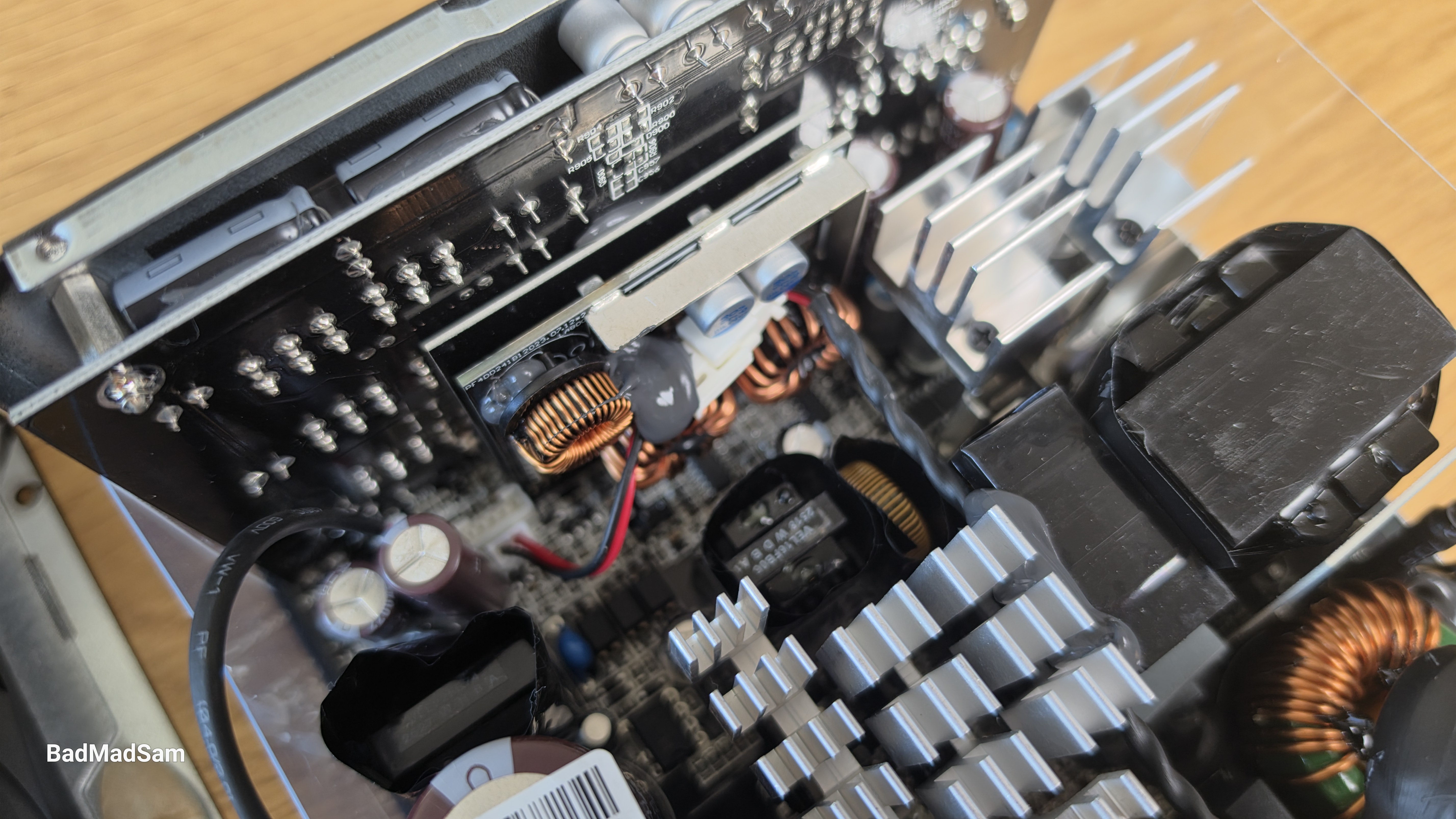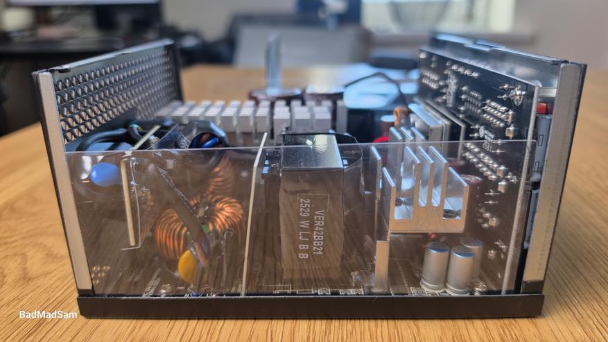 Внутри все собрано плотно, но без ощущения, что элементы просто утрамбовали в корпус. Со стороны сетевого разъема расположена входная часть, дальше по плате идет силовая зона, а ближе к выходу — вторичная часть и преобразование малых линий. Ничего не накладывается друг на друга. Основная нагрузка сосредоточена в центральной части. Здесь установлены радиаторы, и именно на них приходится вся силовая работа. Центральный радиатор самый крупный, он перекрывает ключевые элементы преобразователя. По краям расположены дополнительные радиаторы меньшего размера, которые закрывают остальные зоны. Такое распределение выглядит правильным.