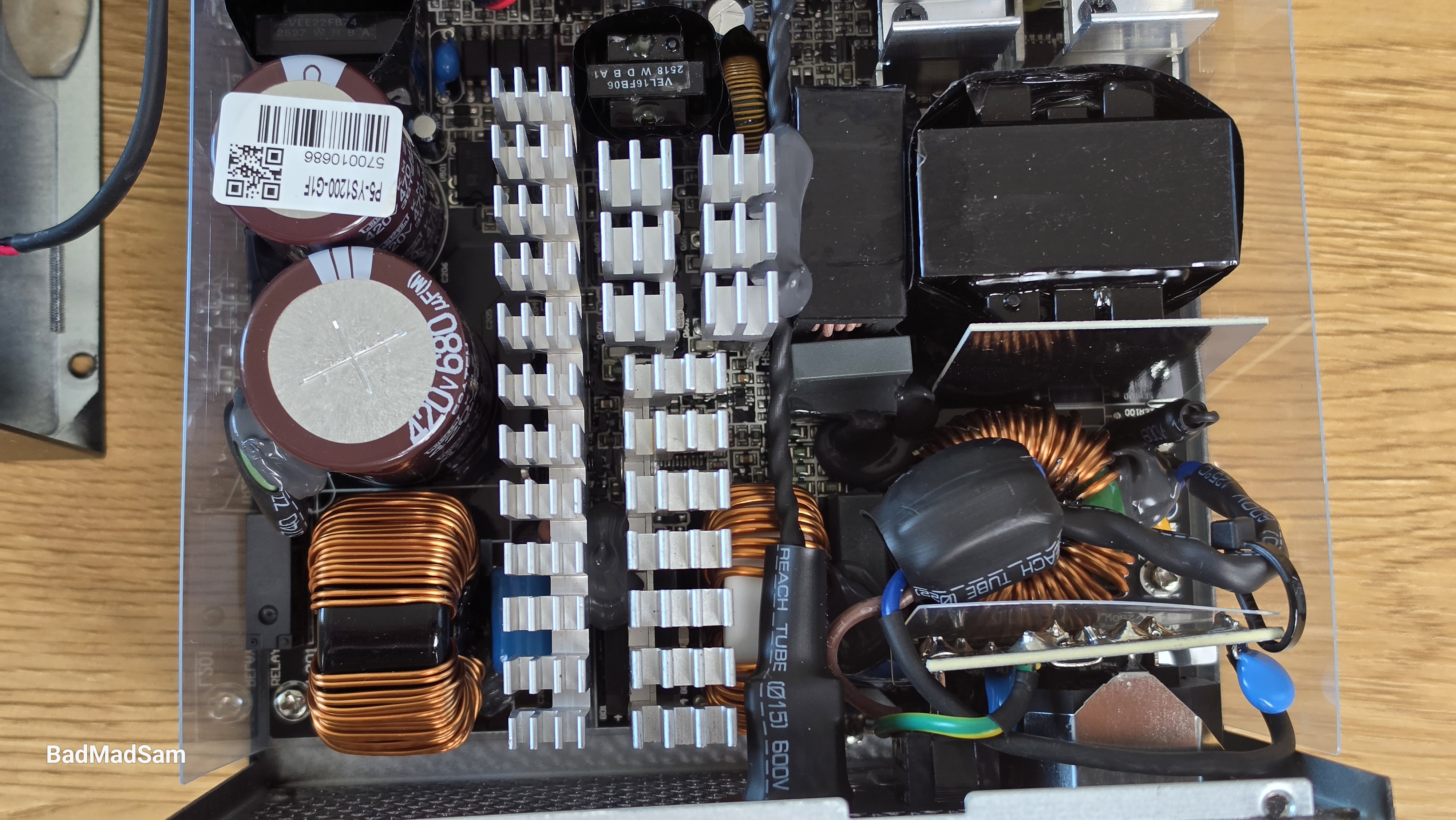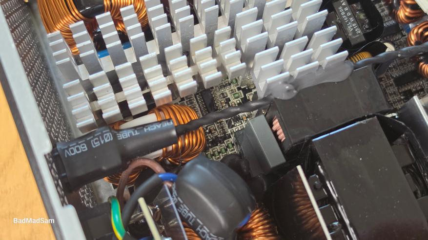В этой же зоне находятся основные элементы первичной цепи. Видны два входных конденсатора с рабочим напряжением 420 В и суммарной емкостью около 1150 мкФ. Для блока на 1200 Вт это нормальный запас, без экономии на емкости. Рядом расположены дроссели и трансформаторный узел, все собрано компактно. Схема построена по привычной для современных блоков логике. Используется активный PFC, далее идет LLC-преобразователь, а линии 3.3 В и 5 В формируются через отдельную DC-DC плату. Основная нагрузка приходится на линию 12 В с током до 100 А. Это стандартная схема для мощных блоков, где вся работа сосредоточена именно на 12-вольтовой линии.