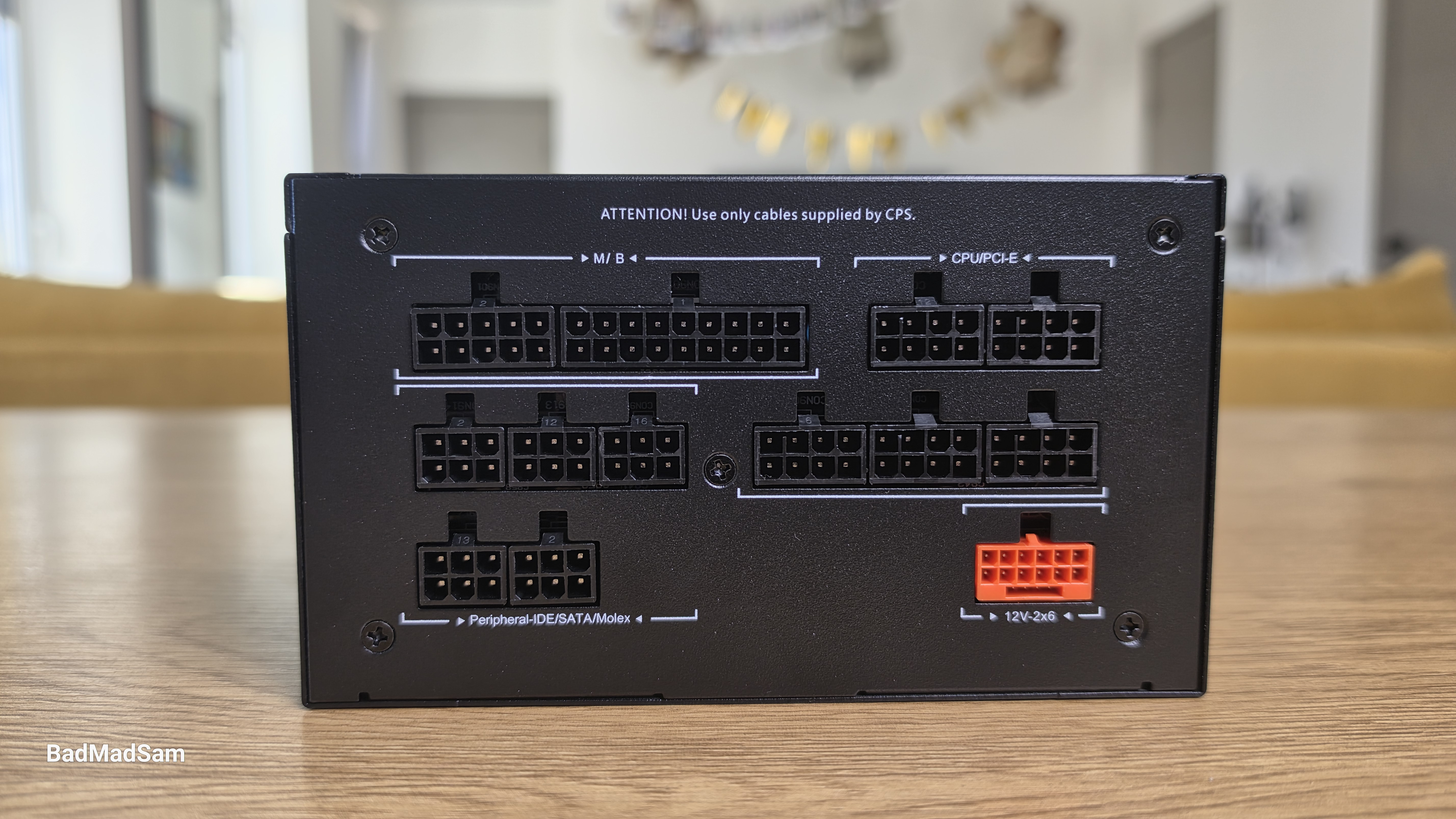 Модульная панель собрана аккуратно. В верхней части сразу выделяется оранжевый разъем 12V-2x6, он один и хорошо заметен на фоне остальных. Остальные разъемы черные и сгруппированы по назначению. Слева расположены разъемы под кабель материнской платы, ближе к центру и справа идут группы для питания процессора и видеокарт, а в нижней части выделена зона под SATA и периферию. Подписи есть, но они не броские, при этом ориентироваться по ним удобно. Вся панель достаточно продумана, нет ощущения, что разъемы просто расставлены без логики.