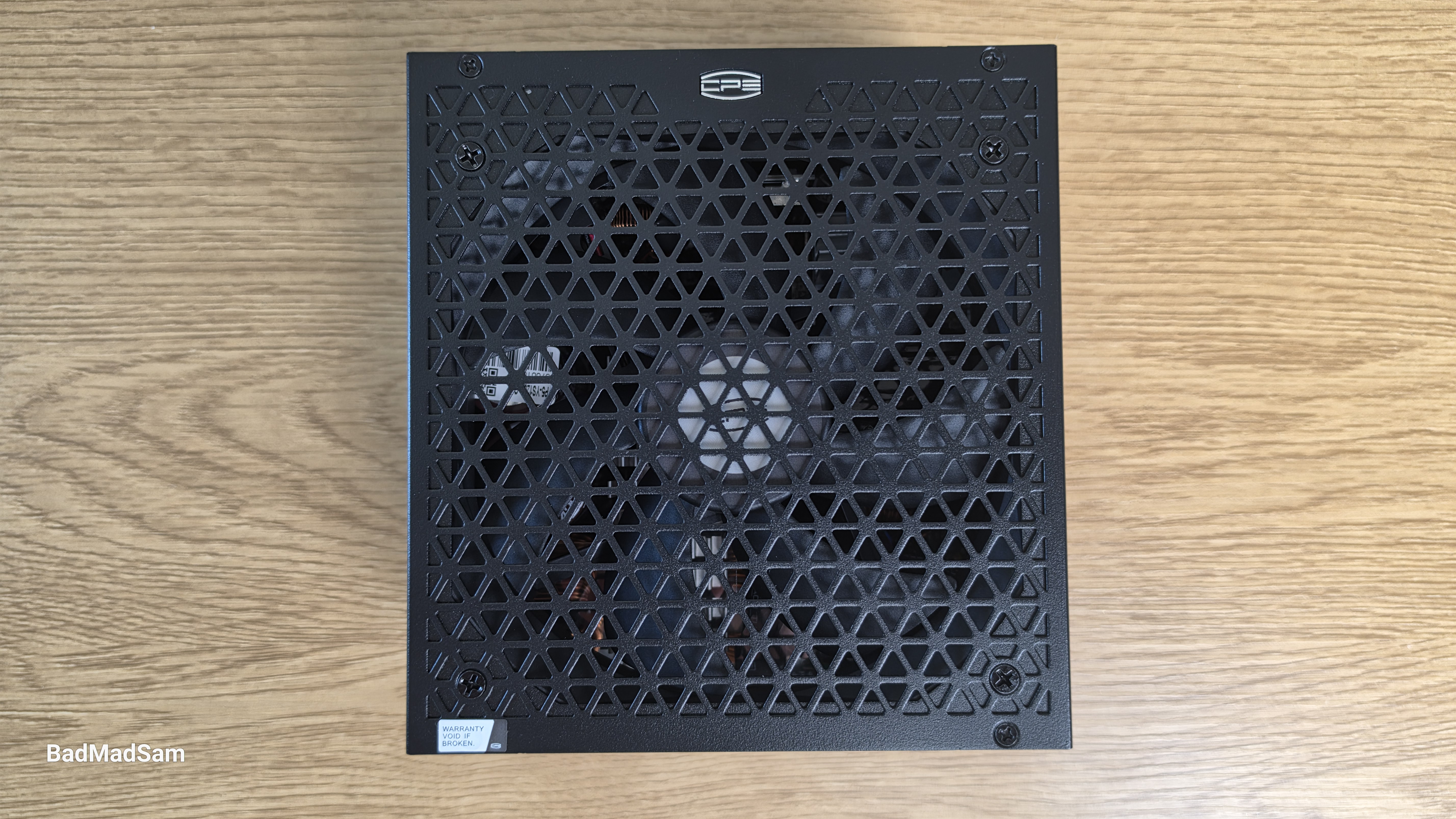 Верхняя часть почти вся занята решеткой под вентилятор. Она штампованная, с повторяющимся треугольным рисунком, и за счет этого поверхность не ощущается пустой. Сквозь нее хорошо видно сам вентилятор, центральную втулку и часть лопастей. Отступы по краям минимальные, поэтому вся верхняя плоскость воспринимается как единое поле под охлаждение. В углах аккуратно утоплены винты, а вдоль одной из граней нанесен небольшой логотип, который не бросается в глаза.