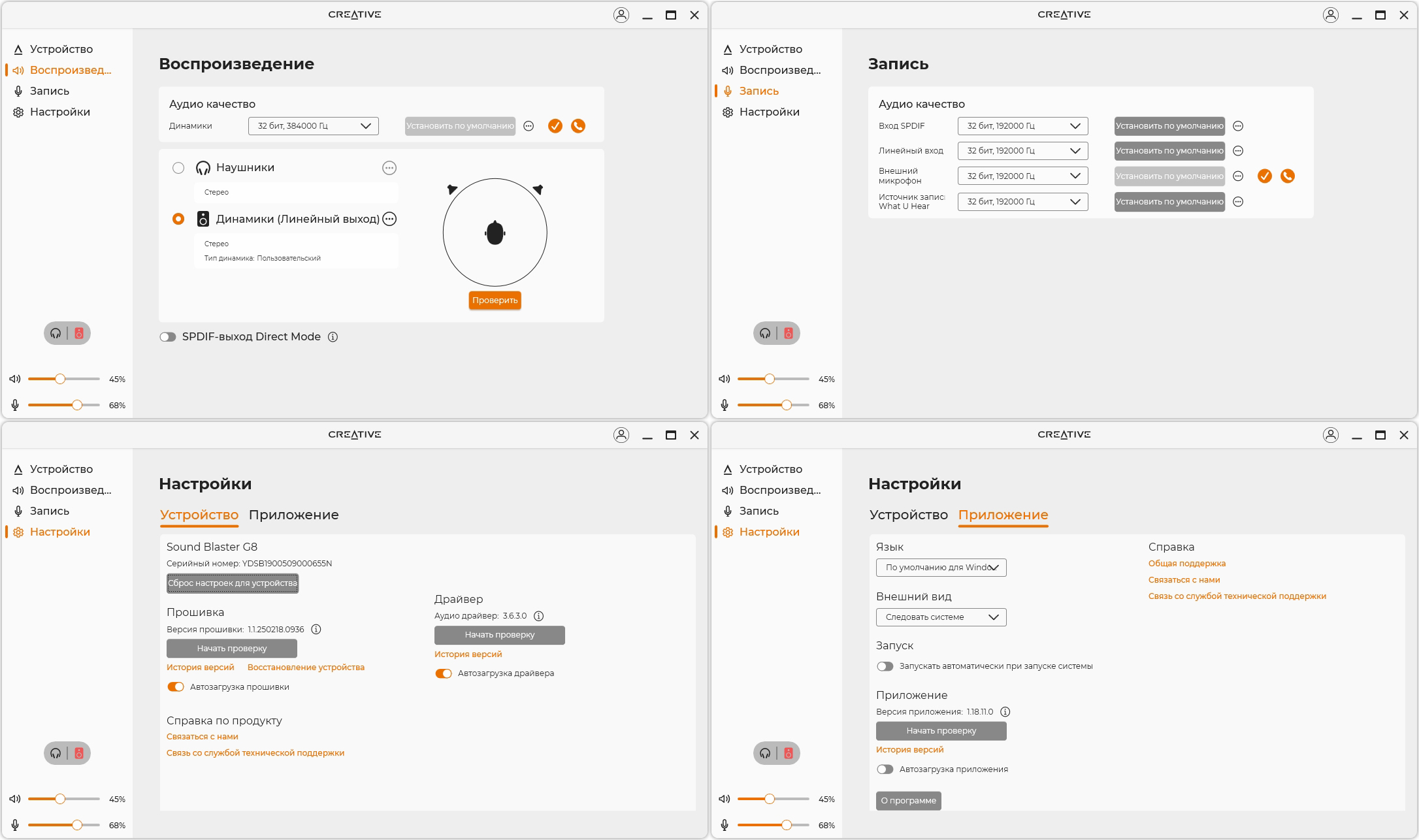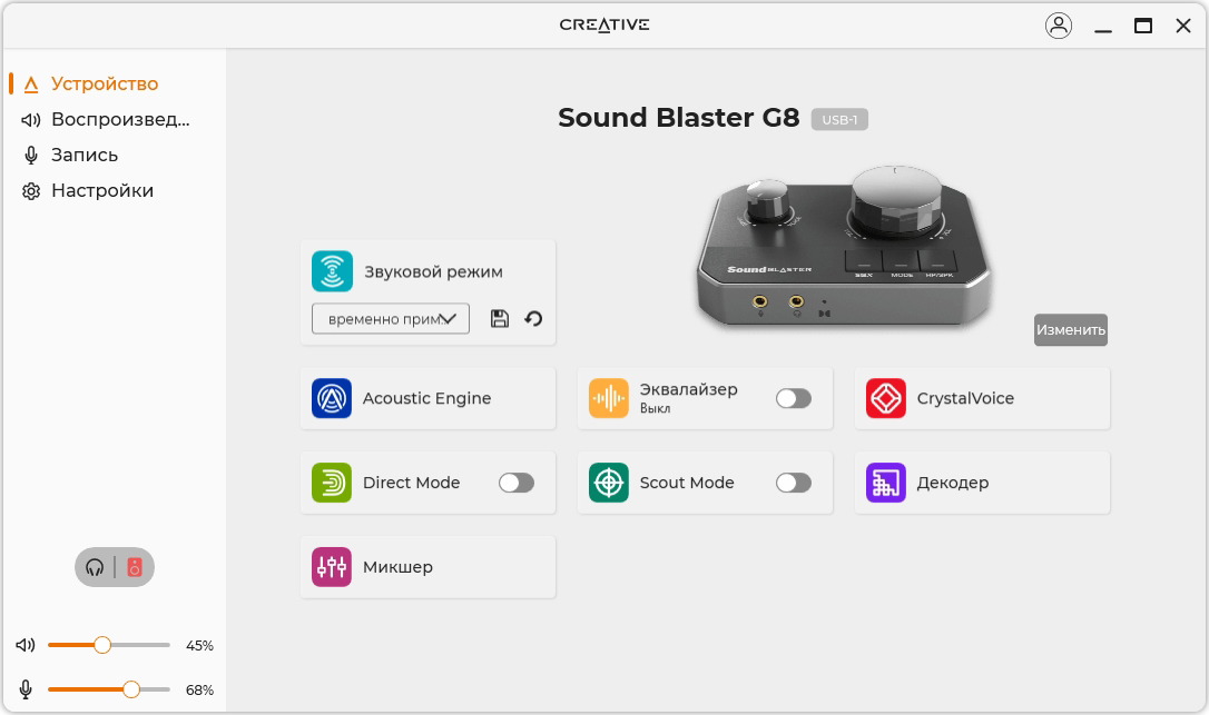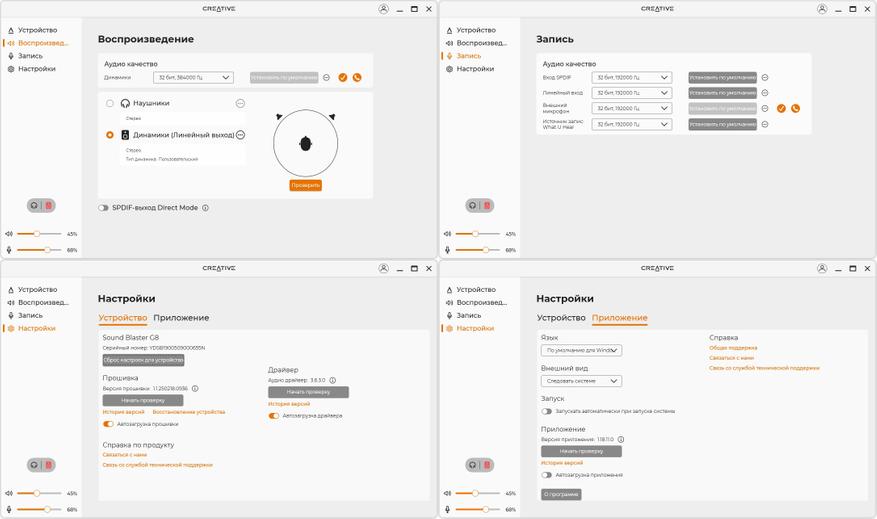 Управлять устройством помогает специализированное ПО Creative App. После запуска программа предложит обновиться до актуальной версии прошивки и драйверов.