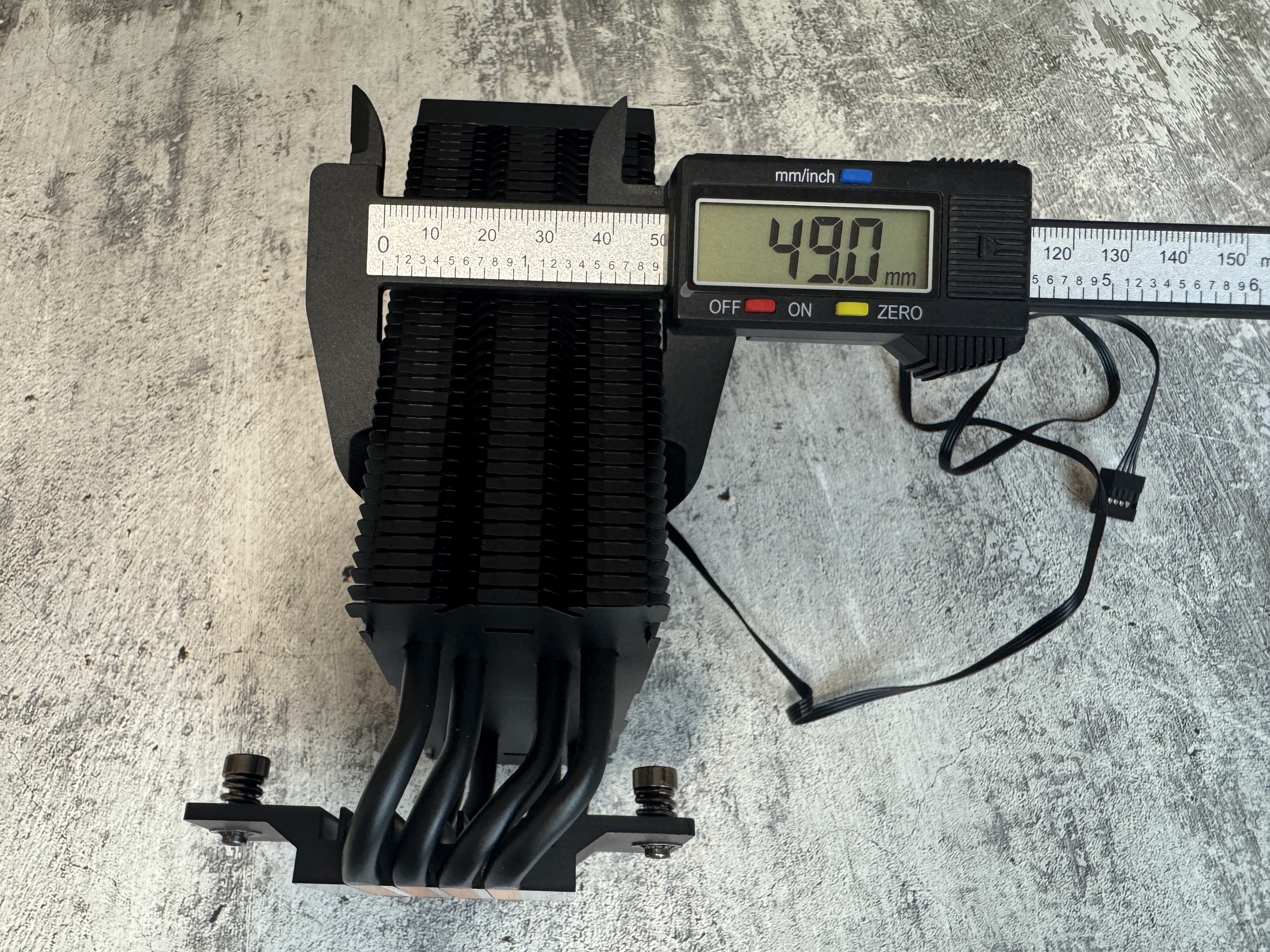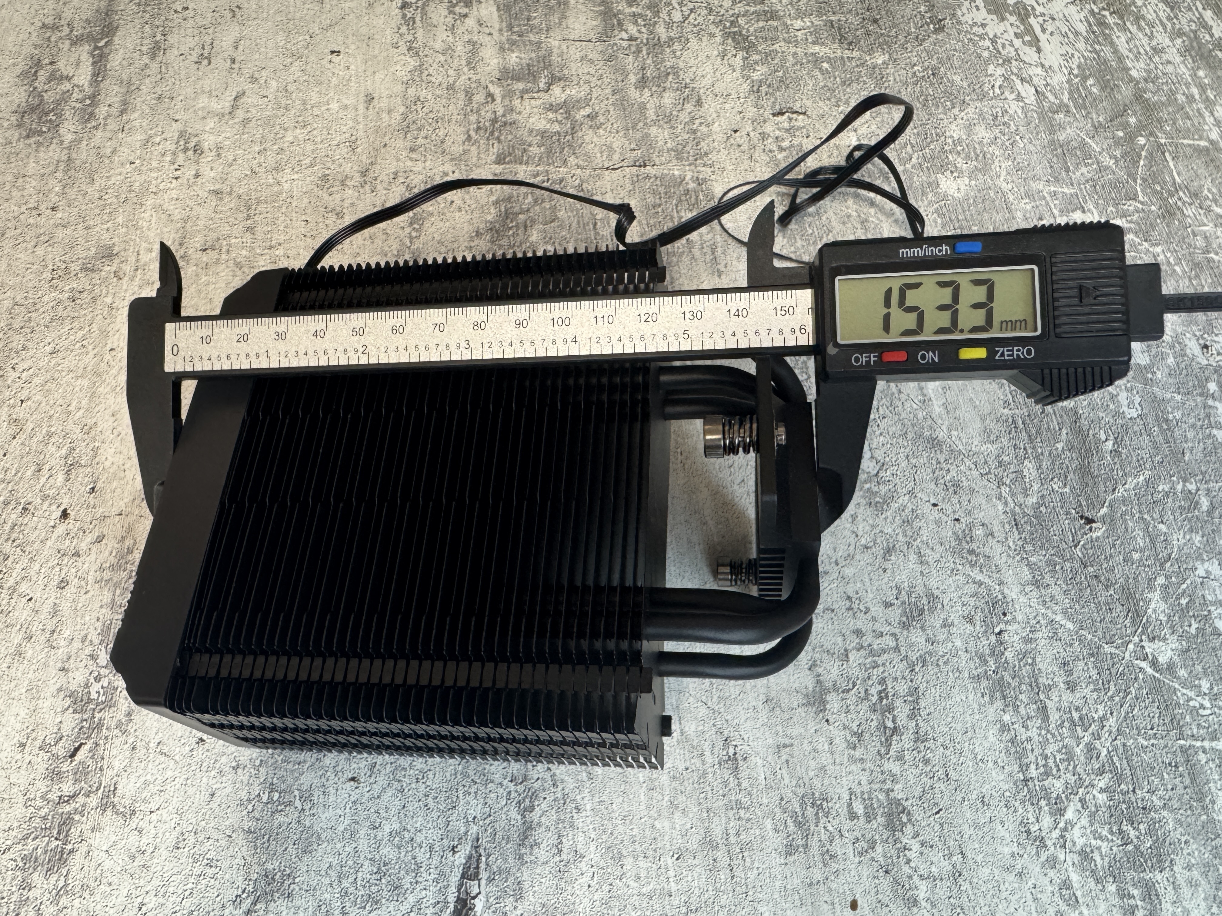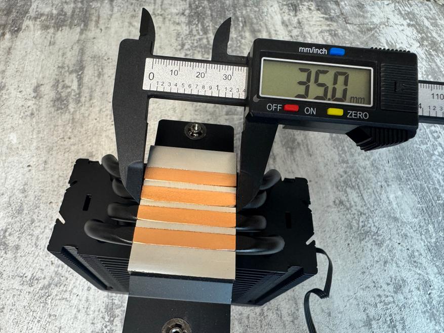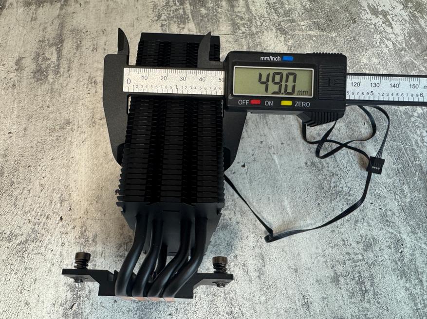 Размеры радиатора 153 x 49 x 119 мм, размеры контактной пластины 35 x 48.6 мм, вес 320 грамм.
