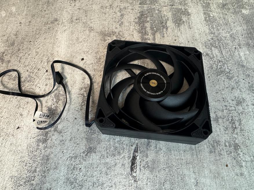 Комплектный вентилятор имеет довольно стандартные размеры и выполнен в черном матовом цвете. На углах корпуса имеются резиновые вставки, которые предотвращают передачу вибрации с вентилятора на радиатор. Крыльчатка имеет 7 лопастей, которые создают воздушный поток 93.29 CFM. Вентилятор подключается при помощи 4 PIN разъема и автоматически изменяет обороты вентилятора от 900 до 3000 об/мин. На оборотной части имеется информационная наклейка на которой имеется логотип компании без указания модели вентилятора. В сердце крыльчатки установлен гидродинамический подшипник, как и у большинства вентиляторов того же класса.