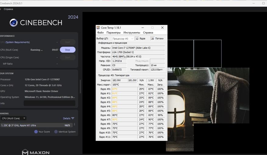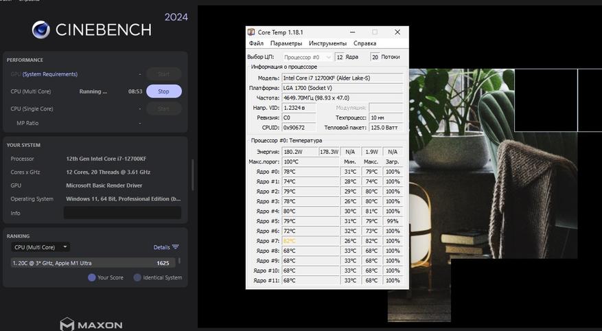 Даже во время теста с использованием утилиты Cinebench 2024 мы видим весьма хорошее понижение температуры после замены термопасты. И даже при 180 Вт, процессор чувствует себя хорошо и кулер вполне прилично справляется со своими задачами.
