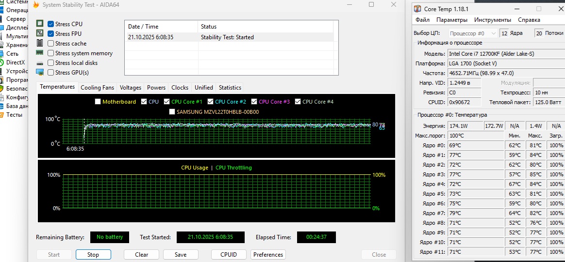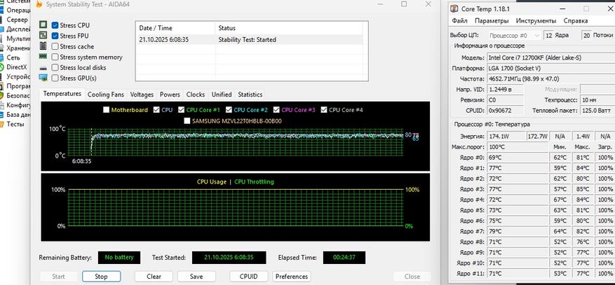 При повторном тестировании в утилите AIDA 64 с использованием новой термопасты мы получаем 174 Вт и температуры от 71 до 75 градусов.