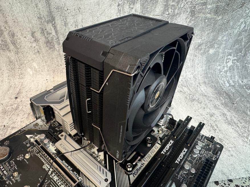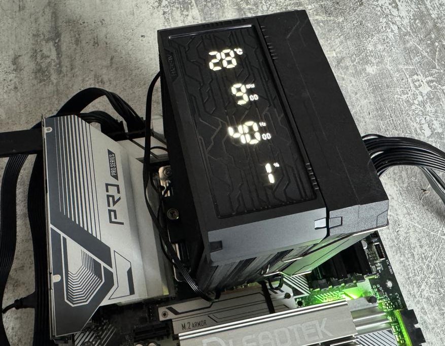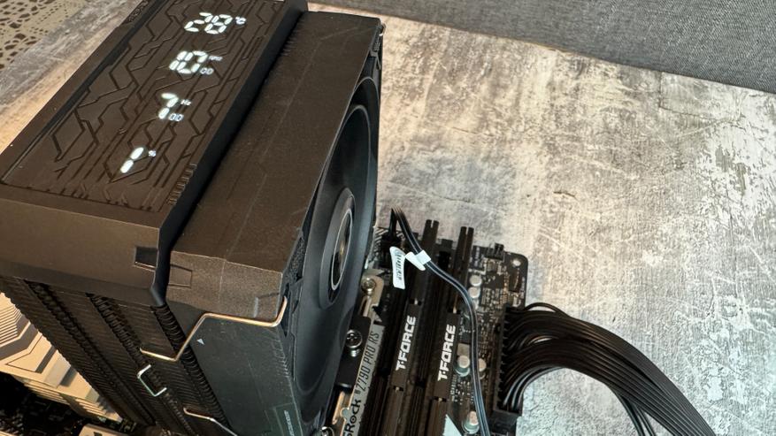 Устанавливается кулер также, как и большинство моделей данного класса. Для установки кулера на процессор Intel мне пришлось установить комплектный бэкплейт на оборотную часть материнской платы. Для дальнейшей установки нам необходимо установить направляющие при помощи винтов и пластиковые втулки. Далее наносим тонким слоем термопасту и аккуратно устанавливаем радиатор с последующей фиксацией его к направляющим. Последним этапом мы устанавливаем вентилятор при помощи металлических скоб и подключаем к материнской плате при помощи 4 PIN разъема. Подсветки у вентилятора нет, как и 3 PIN разъема. Сам радиатор имеет дисплей и его необходимо подключить к разъему USB на материнской плате.