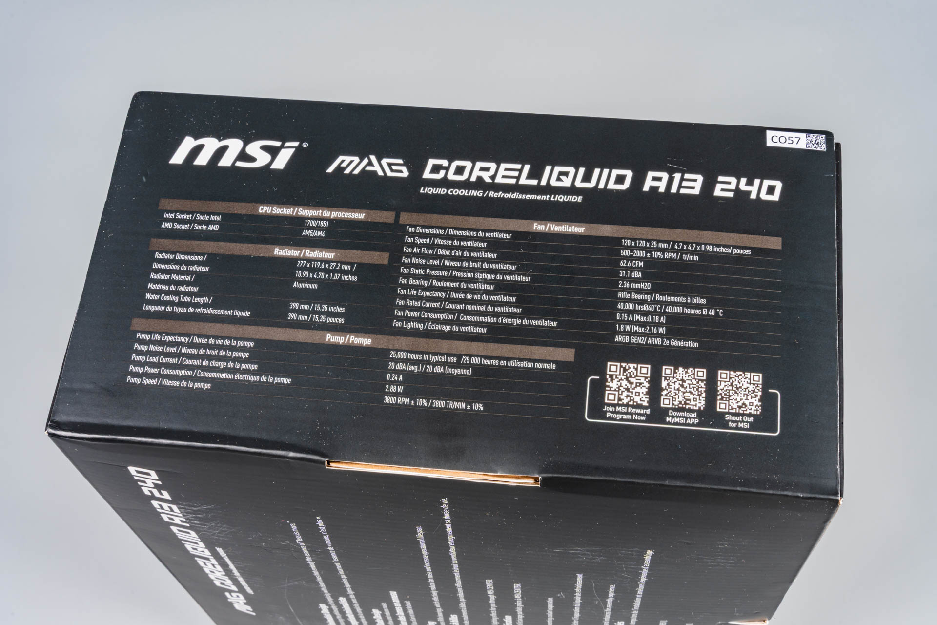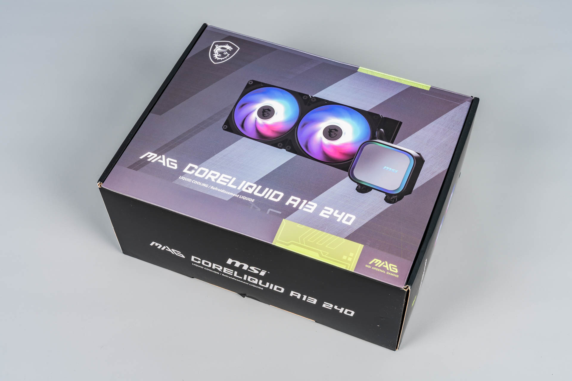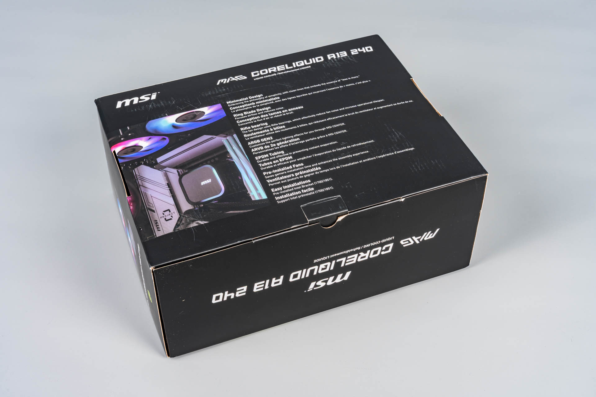 Упаковка MSI MAG CoreLiquid A13 240 выполнена в фирменном стиле линейки MAG, сочетающем лаконичность и технологичность. На лицевой стороне выделяется логотип MSI Gaming, название модели и обозначение форм-фактора (например, «240» для версии с двумя 120-мм вентиляторами). Задняя часть содержит схематичное изображение устройства, ключевые характеристики и описание технологий, таких как Rifle Bearing в вентиляторах. Этот тип подшипника с винтовой нарезкой обеспечивает долговечность до 40 000 часов, превосходя даже ресурс помпы.