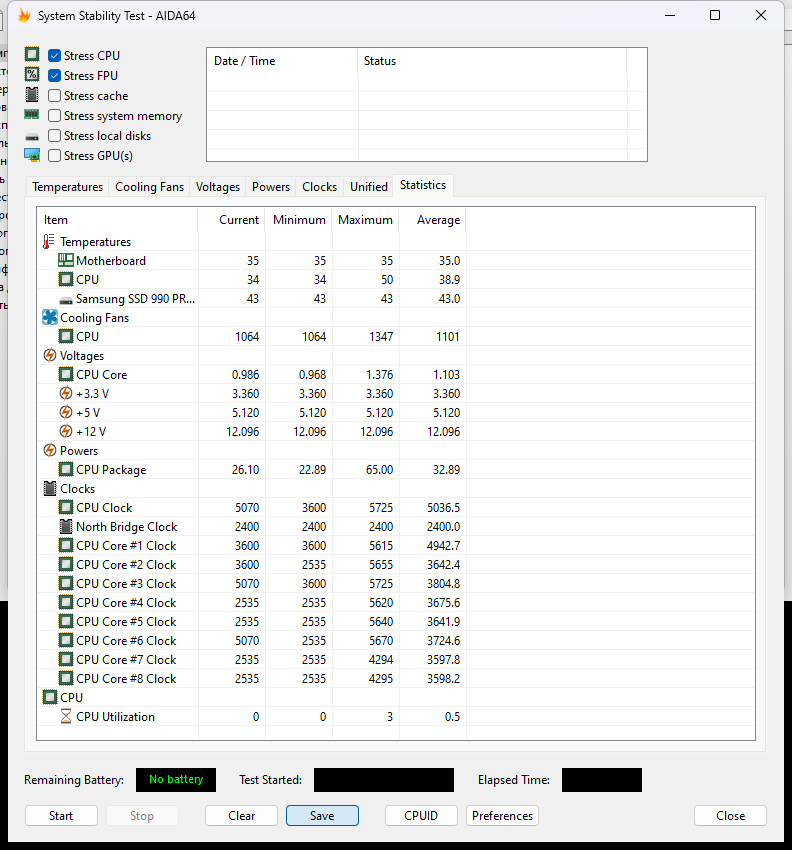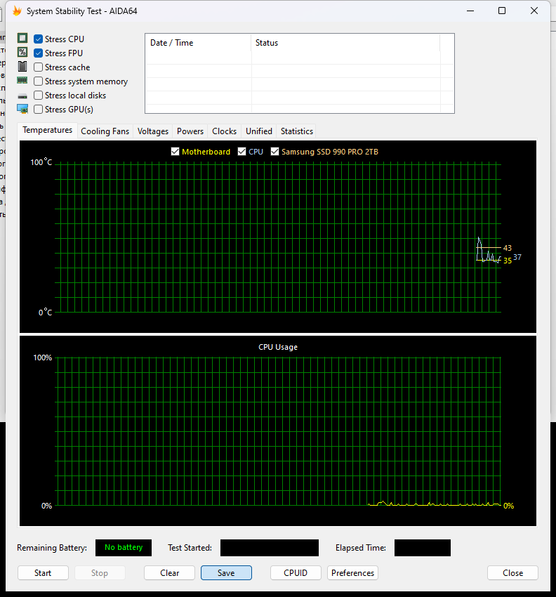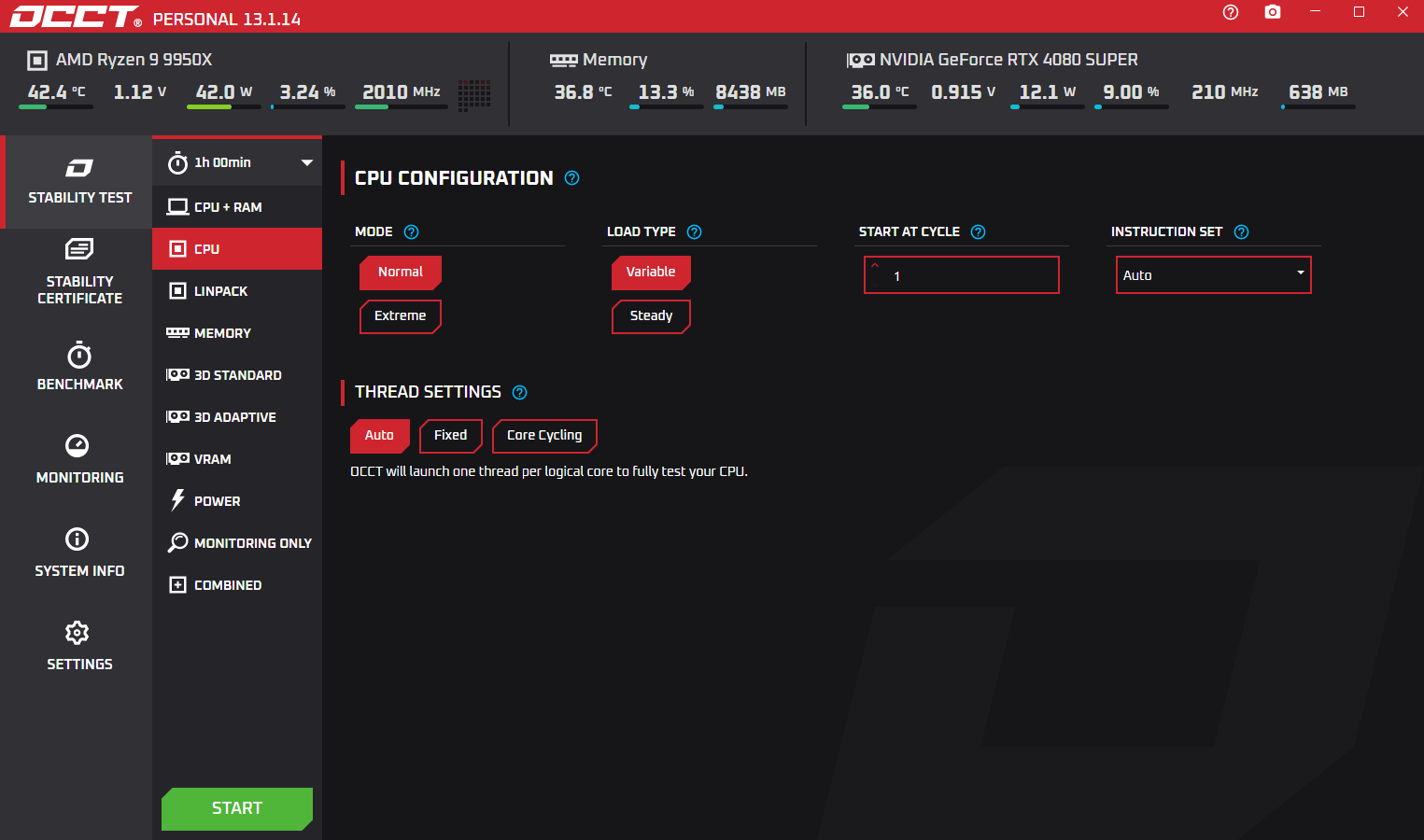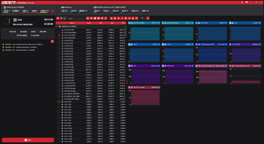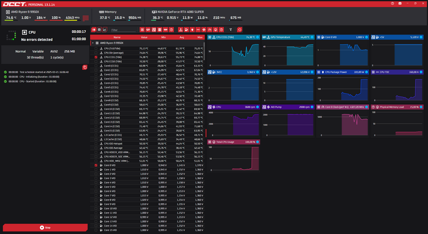 Для оценки базовой эффективности системы был взят процессор AMD Ryzen 9 9950X. Первым выбран стресс-тест в программе OCCT с настройками по умолчанию. Такой подход позволяет оценить, насколько хорошо СЖО справляется с охлаждением процессора «из коробки», без ручной оптимизации.