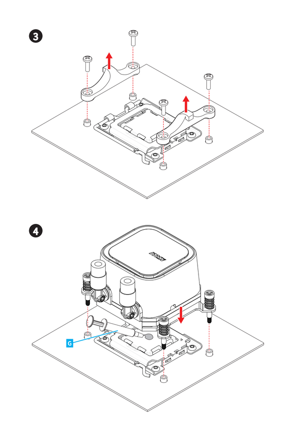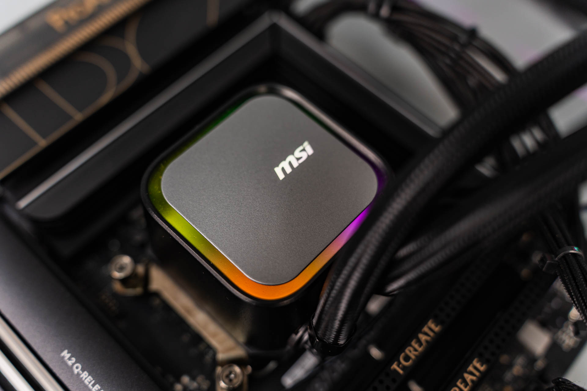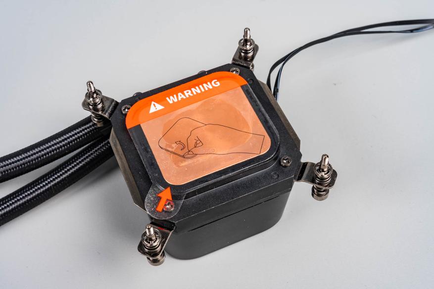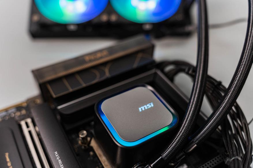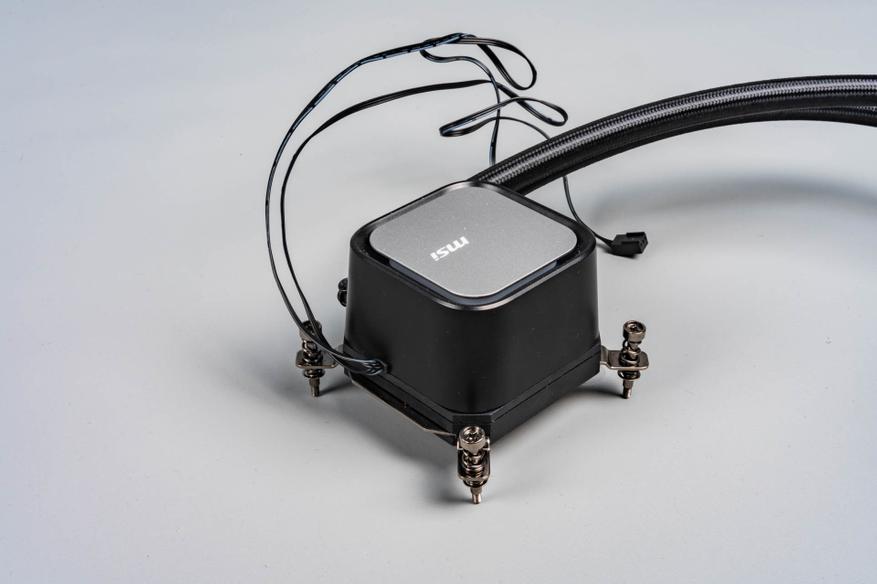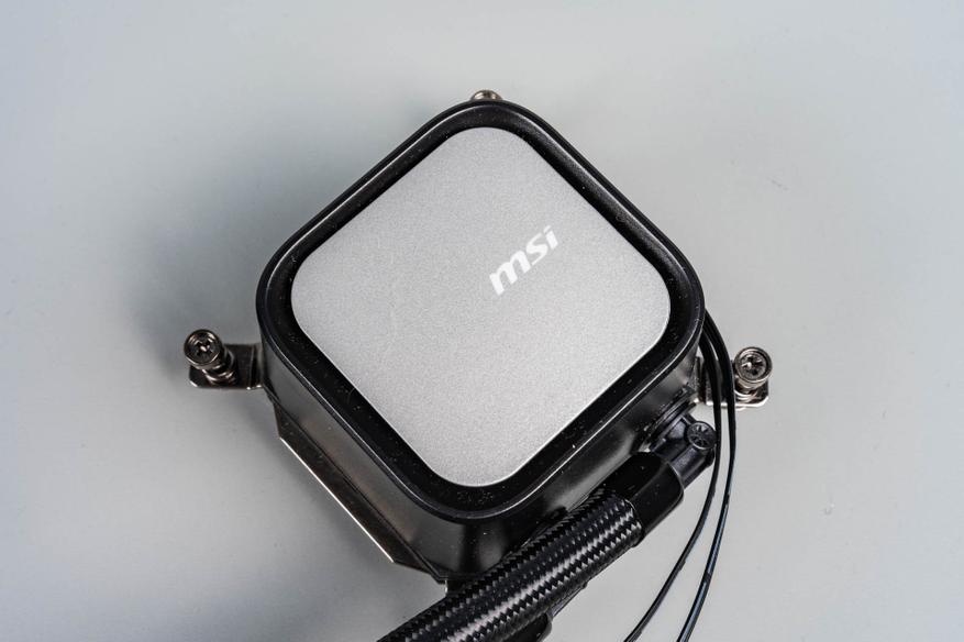 Помпа, встроенная в водоблок, обеспечивает стабильную циркуляцию, а её корпус украшен подсвечивающимся логотипом MSI, создающим эффект «парящего» элемента. Пластиковый кожух скрывает внутренние компоненты, делая систему неразборной — это ограничивает возможность обслуживания. Основание водоблока лишено крепёжных винтов, а термоинтерфейс требуется наносить самостоятельно из приложенного шприца с пастой.