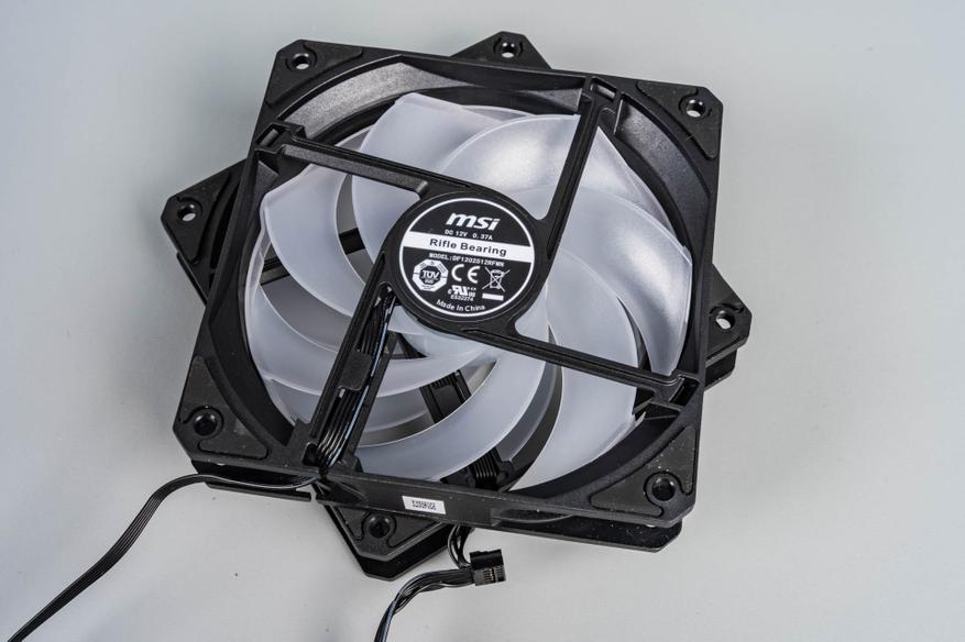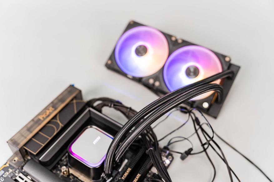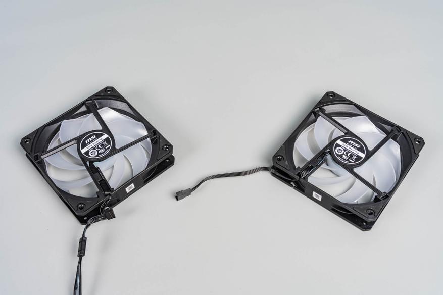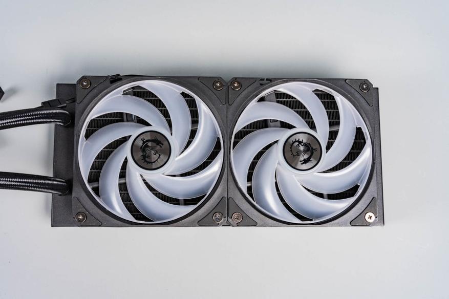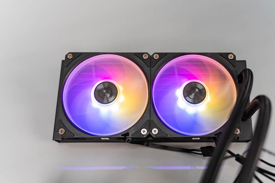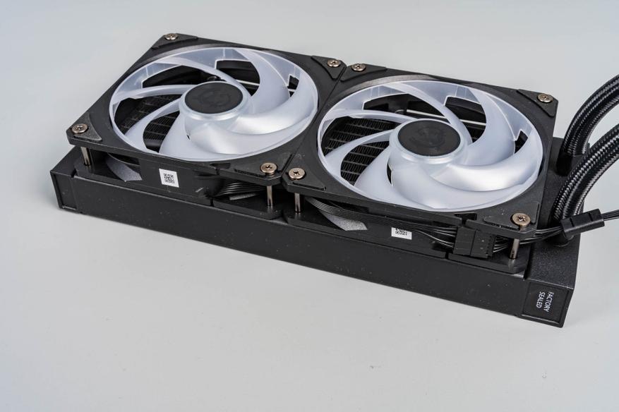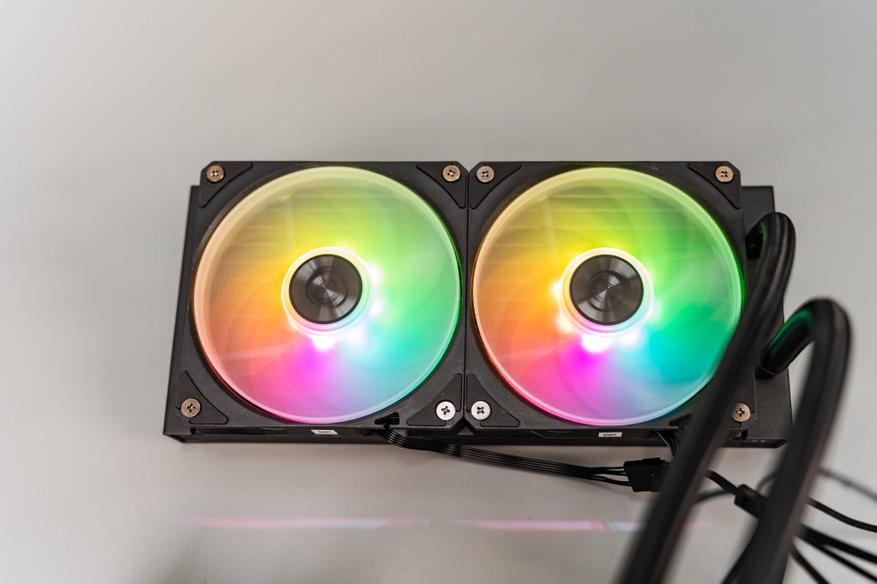 Два 120-мм вентилятора с технологией Cycloblade 7 — оснащены пластиковым ободом, который направляет воздушный поток и защищает лопасти. Несмотря на семь изогнутых лопастей и резиновые антивибрационные прокладки, на максимальных оборотах (2000 об/мин) они становятся шумными из-за сопротивления плотного радиатора. ARGB-подсветка 2-го поколения поддерживает 16,8 млн оттенков и синхронизацию с материнской платой. Однако кабельная система с последовательным подключением усложняет замену одного вентилятора — переходники в комплекте отсутствуют.