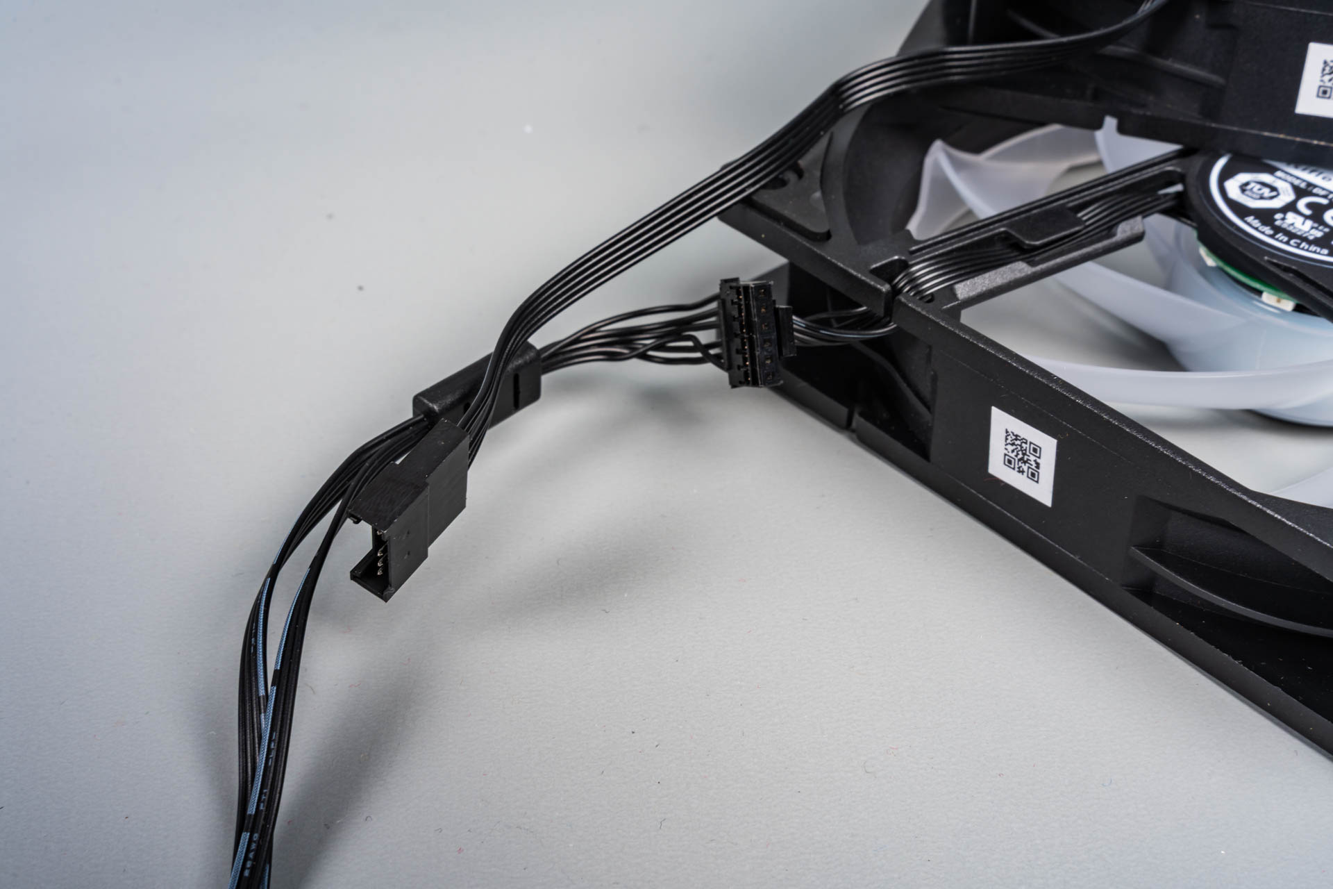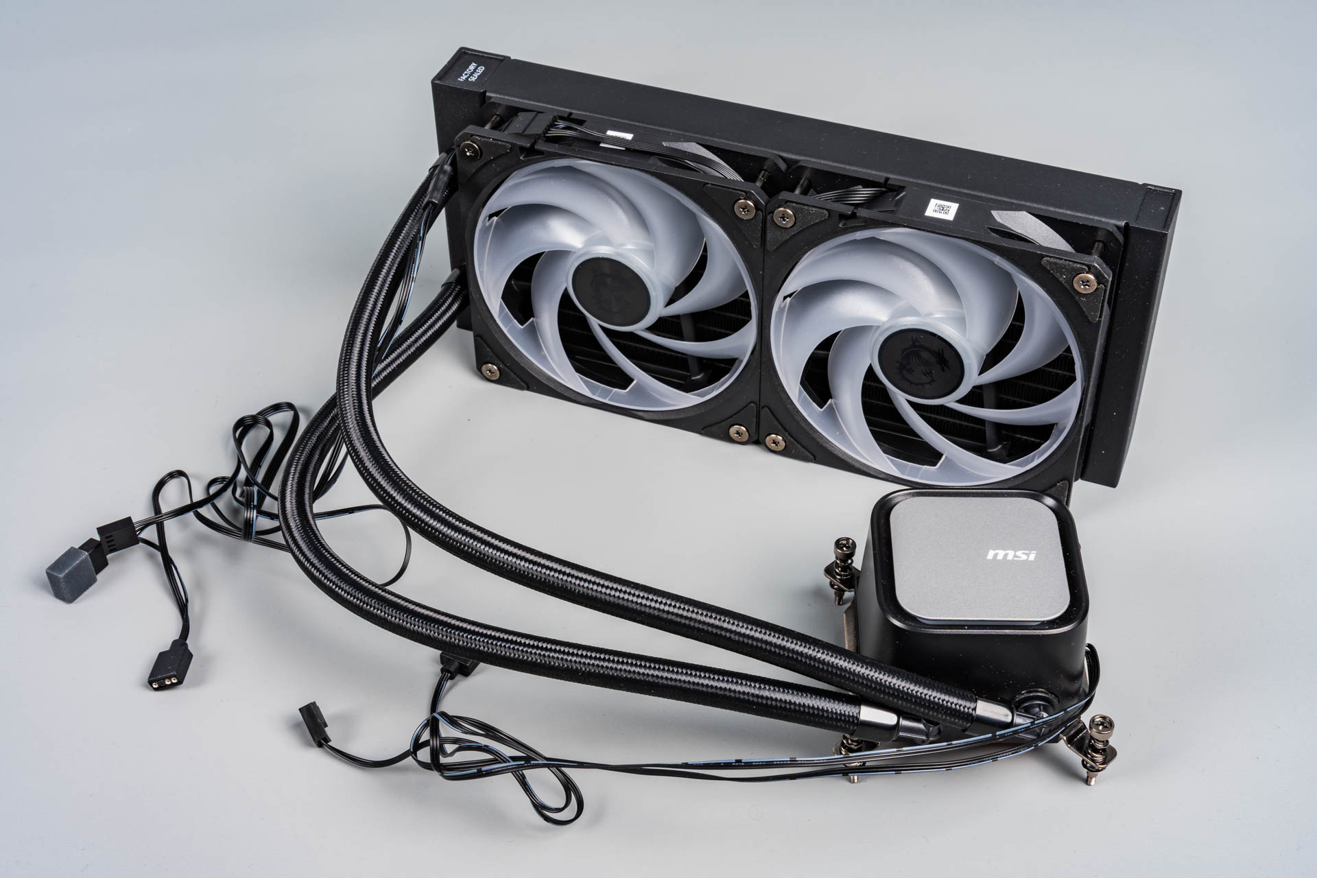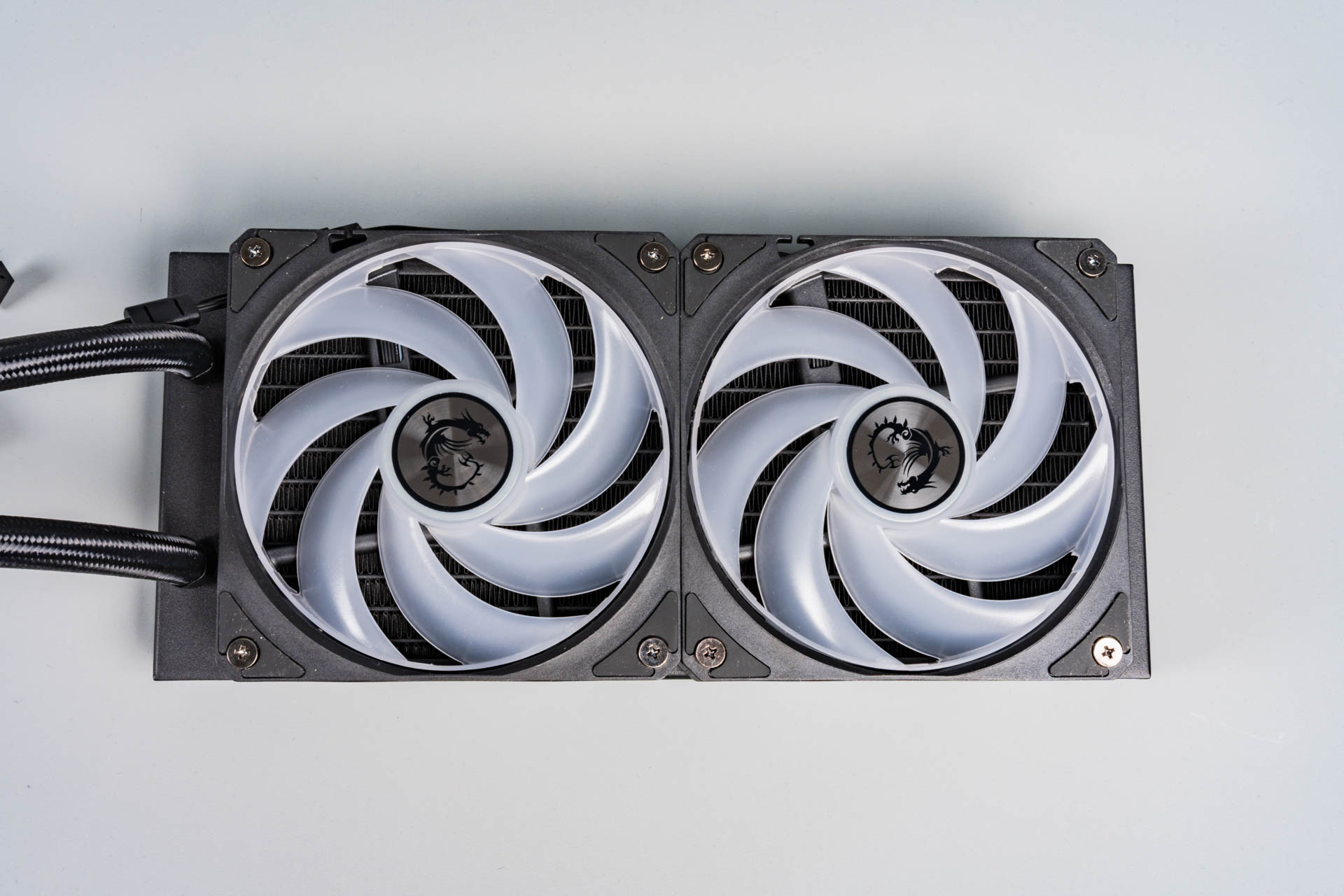 Два 120-мм вентилятора с технологией Cycloblade 7 — оснащены пластиковым ободом, который направляет воздушный поток и защищает лопасти. Несмотря на семь изогнутых лопастей и резиновые антивибрационные прокладки, на максимальных оборотах (2000 об/мин) они становятся шумными из-за сопротивления плотного радиатора. ARGB-подсветка 2-го поколения поддерживает 16,8 млн оттенков и синхронизацию с материнской платой. Однако кабельная система с последовательным подключением усложняет замену одного вентилятора — переходники в комплекте отсутствуют.
