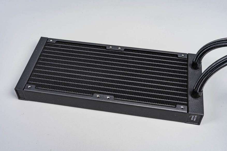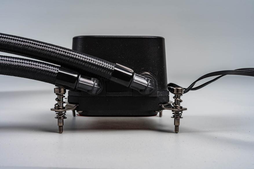 Тепло отводится через медную пластину водоблока с микроканалами, по которым циркулирует жидкость, передавая энергию на радиатор с габаритами 277 x 119,6 x 27 мм.