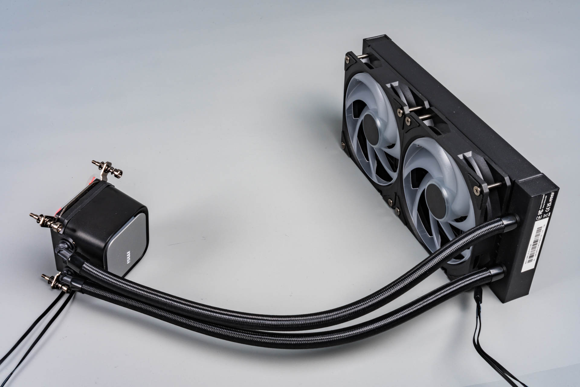 Система жидкостного охлаждения MSI MAG CoreLiquid A13 240 выполнена по классической схеме: водоблок с интегрированной помпой соединён с алюминиевым радиатором двумя шлангами длиной 390 мм.