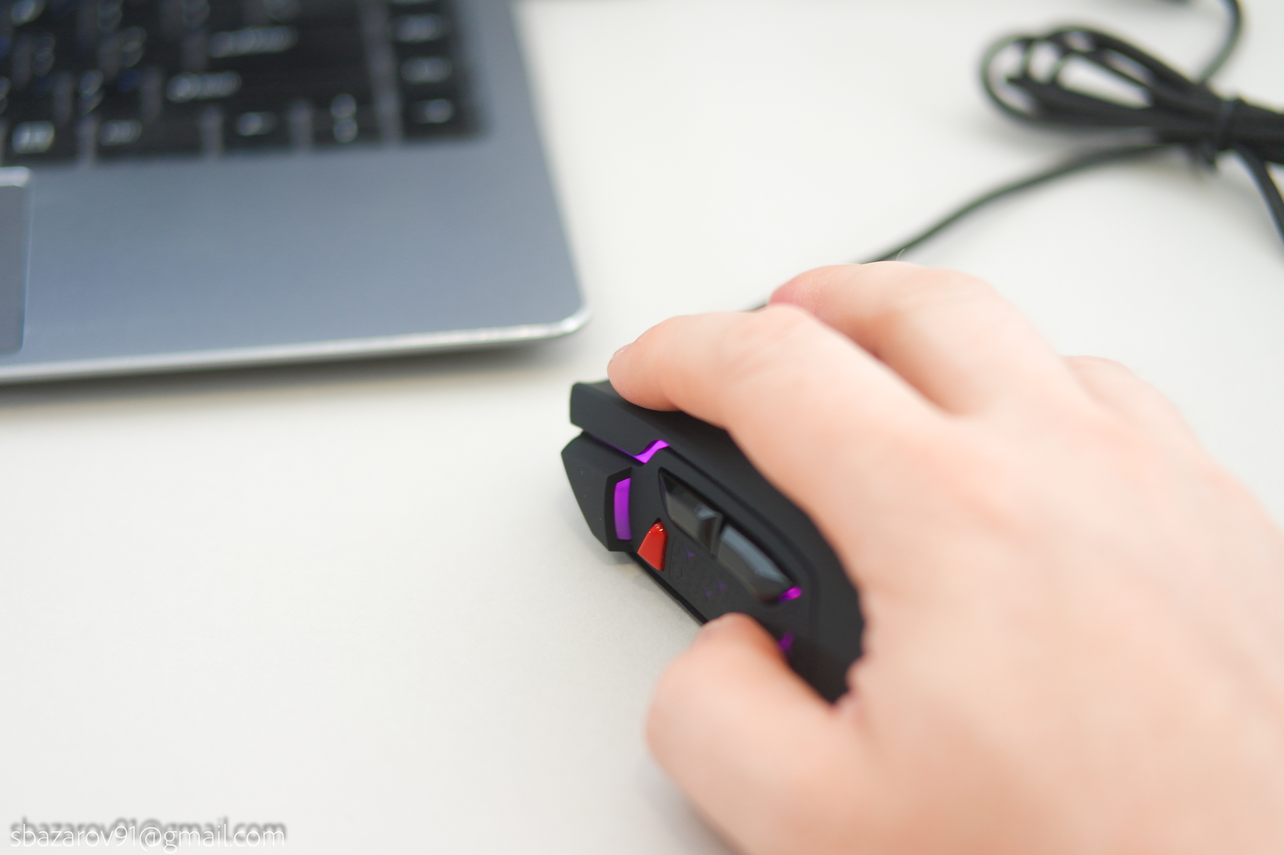 HIPER DRAKKAR GMUS-3000 представляет собой игровой манипулятор с сенсором среднего ценового сегмента, имеющий в своем арсенале систему регулировку веса и интересно оформленную RGB подсветку. Благодаря форме мышки с бугром в левой стороне, она становится отличным компаньоном ладоней разных размеров. Материал корпуса — SoftTouch пластик в паре с глянцевыми дополнительными кнопками. Кнопки ЛКМ и ПКМ являются едиными с самим корпусом и издают средний уровень шума. При долгой работе с мышкой дискомфорта от щелчка нет.