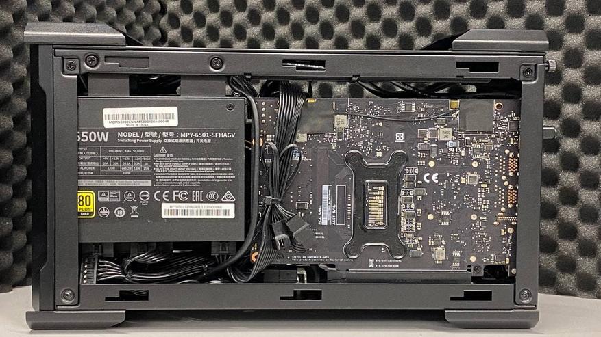 Этот корпус класса ультра-компактного форм-фактора (UCFF), которые используются для создания встроенных и мобильных решений с низким энергопотреблением, но не требующих дисплеев и клавиатуры с тачпадом. Инженеры создали уникальное решение, внутри которого можно разместить как модуль Intel NUC, так и дискретный графический ускоритель.