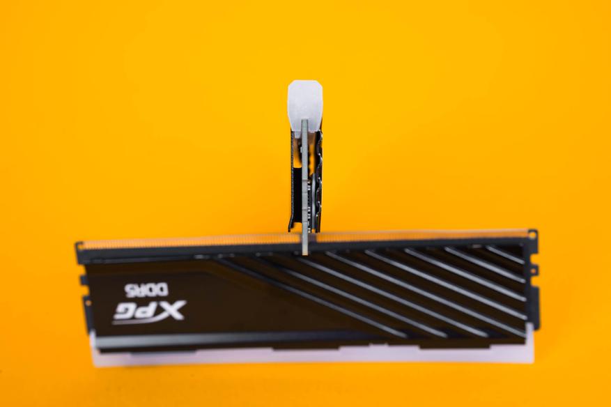 Под радиатором на печатной плате модуля комплекта оперативной памяти DDR5 ADATA XPG Lancer Blade RGB [AX5U6000C3016G-DTLABRBK] 32 ГБ находятся восемь чипов памяти, расположенных с одной стороны. Они контактируют с радиатором через термопрокладку, толщиной около 1 мм.