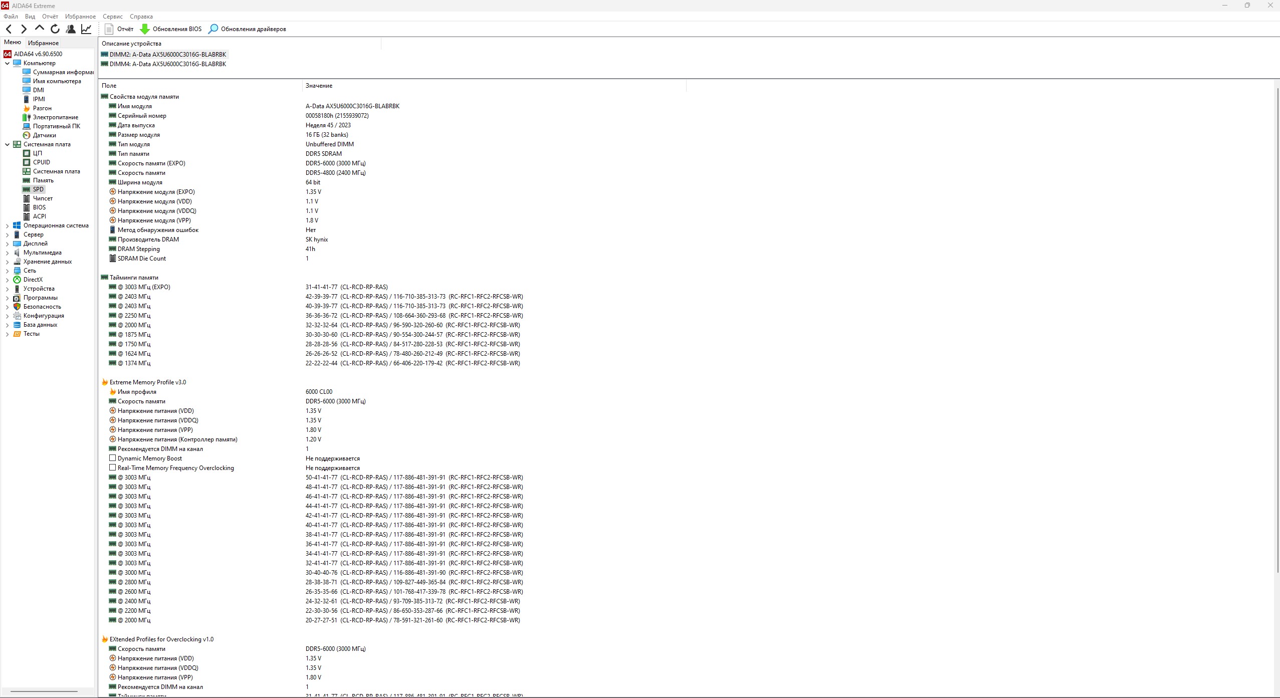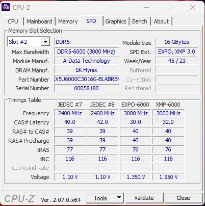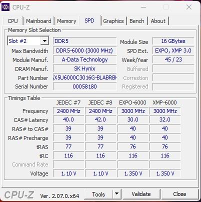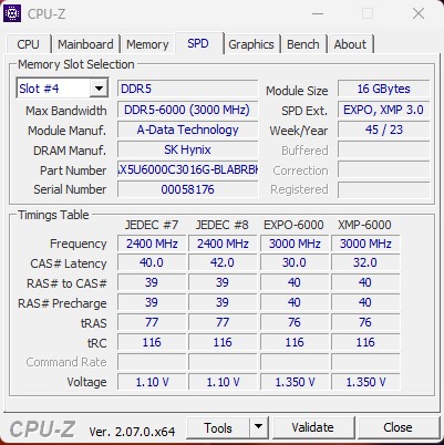 В приложении CPU-Z можно увидеть, что помимо XMP профиля, в XPG Lancer Blade RGB есть и EXPO профиль с таймингами 30-40-40-76.