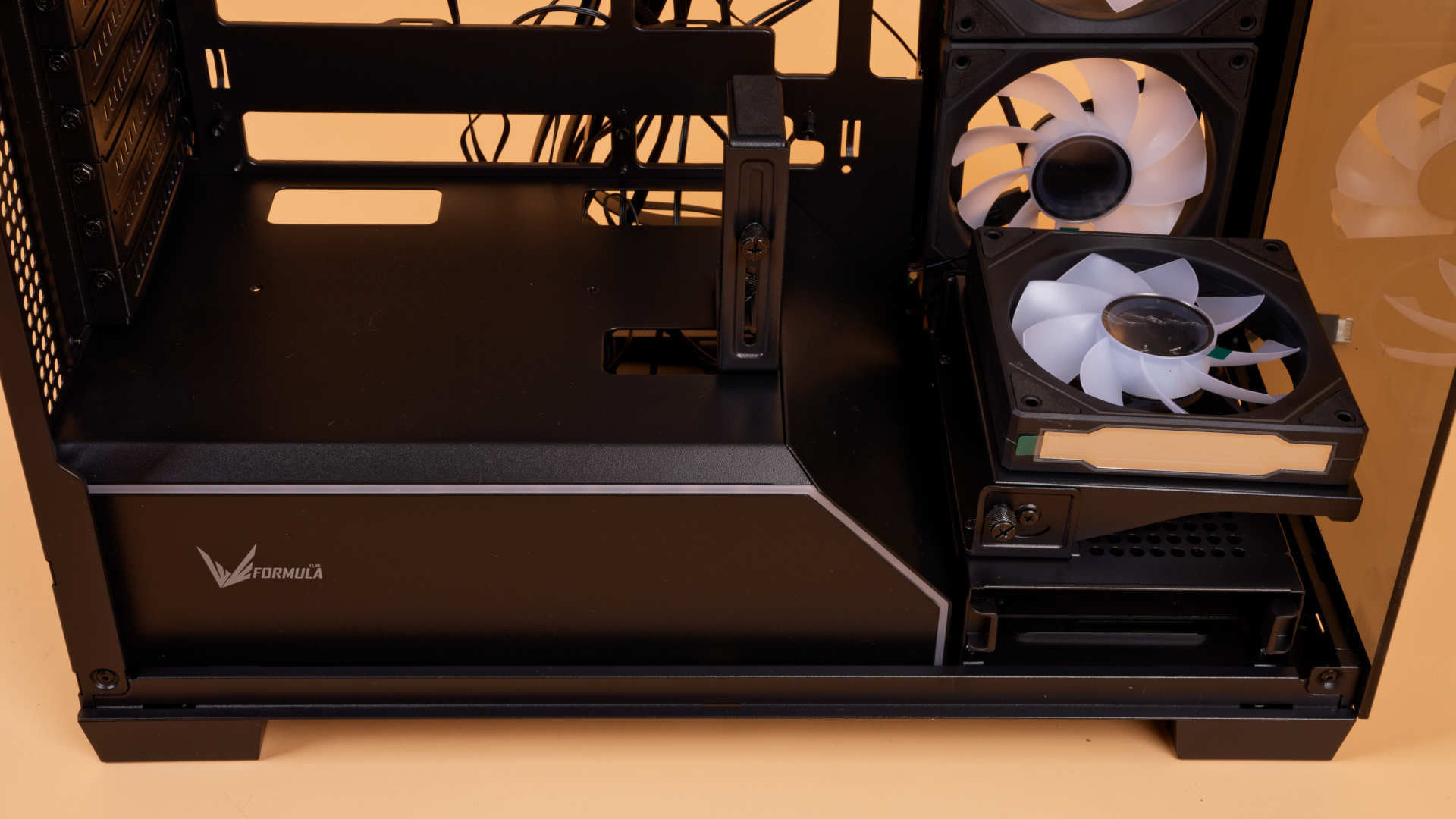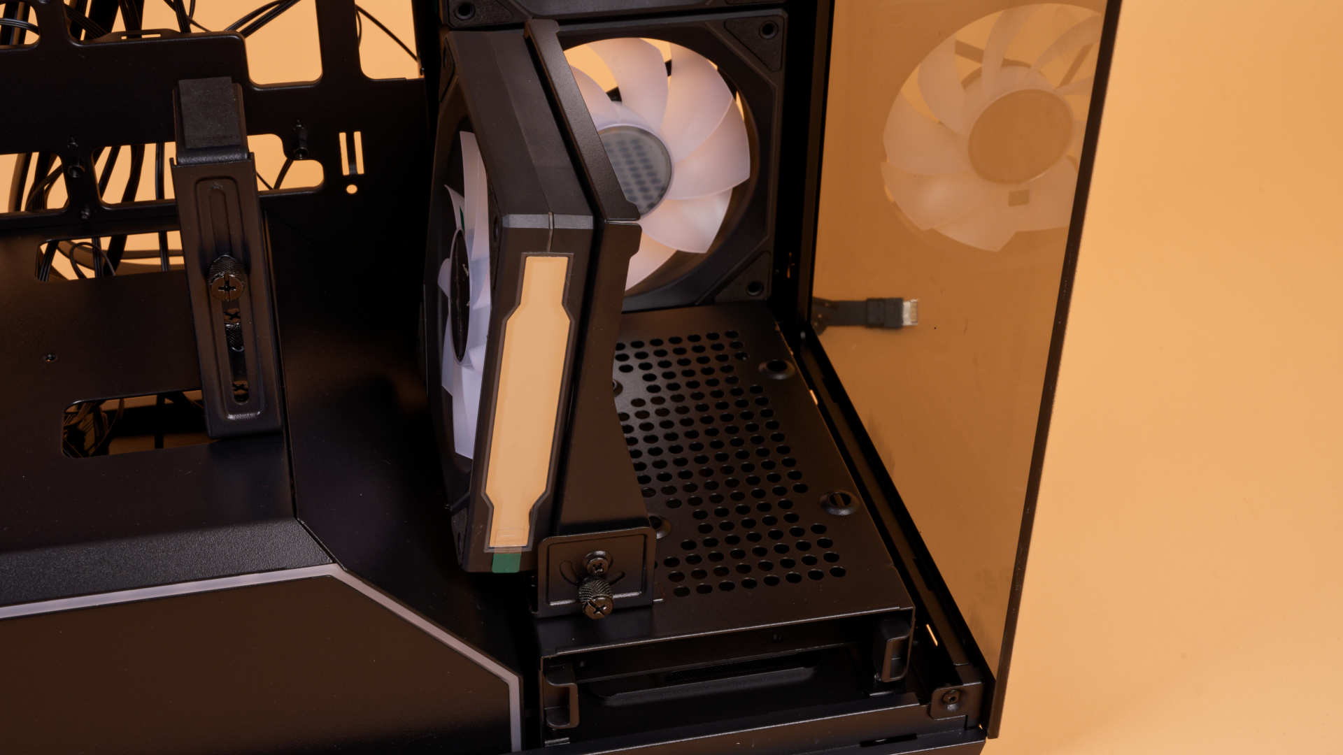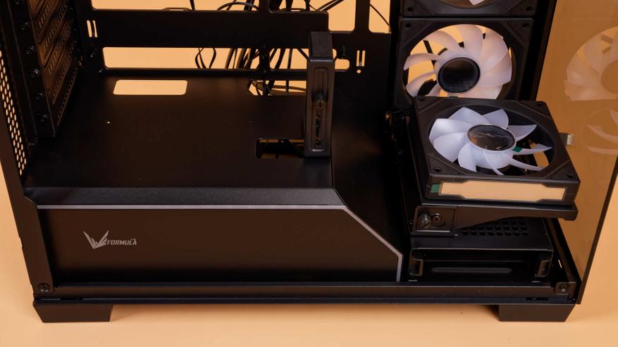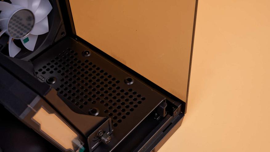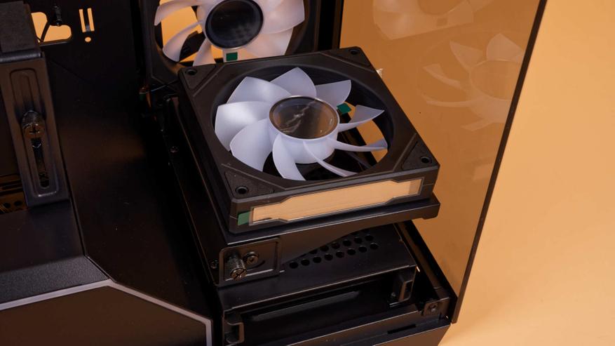 Рядом с кожухом БП располагается корзина для накопителей. На этой корзине установлен реверсивный 120-миллиметровый вентилятор на площадке с изменяемым углом наклона — это позволяет гибко направлять воздушный поток.