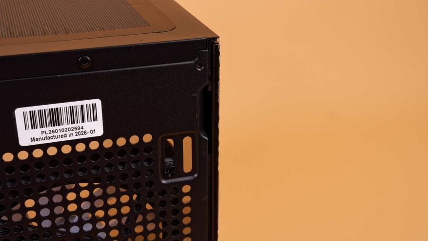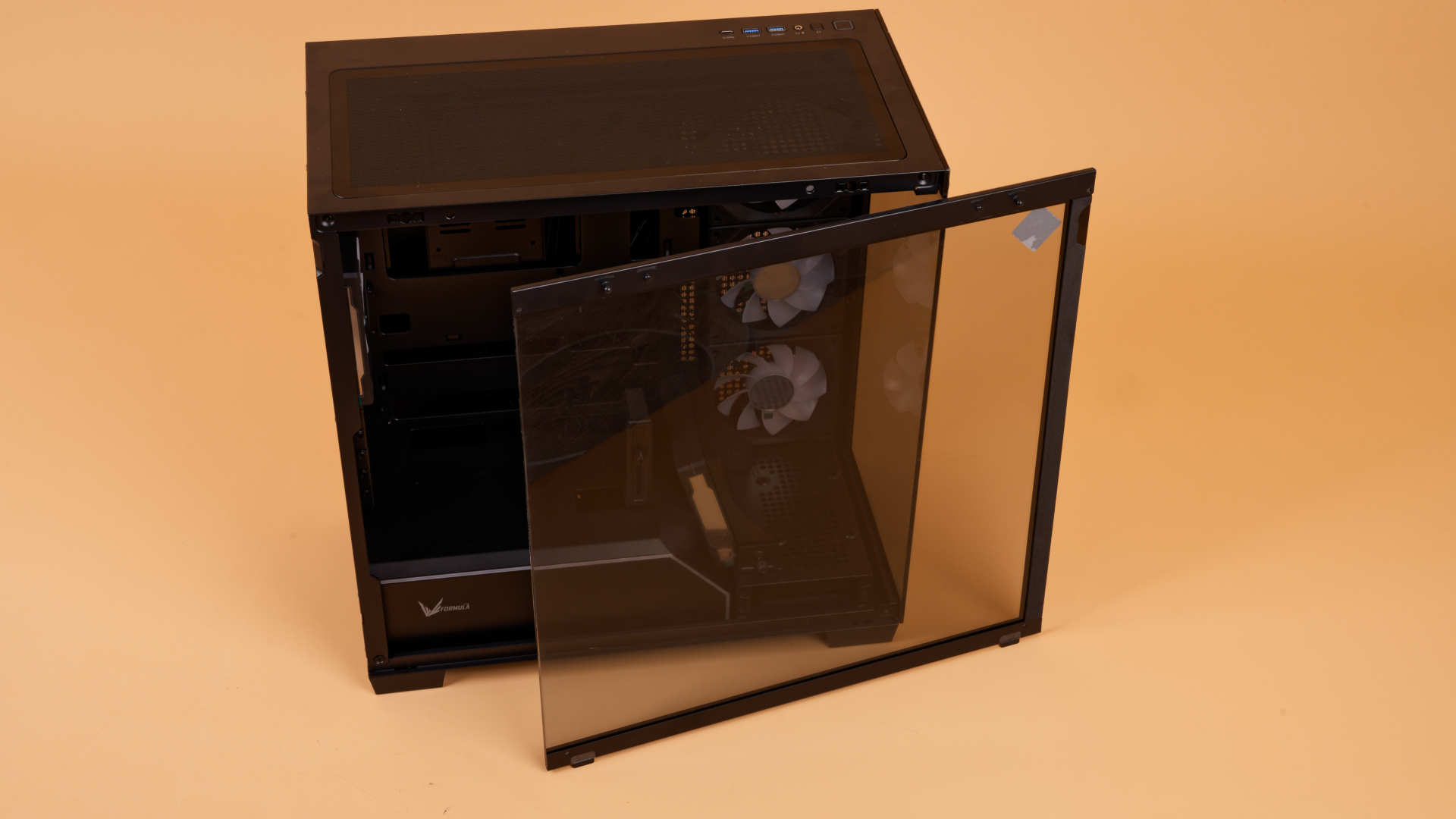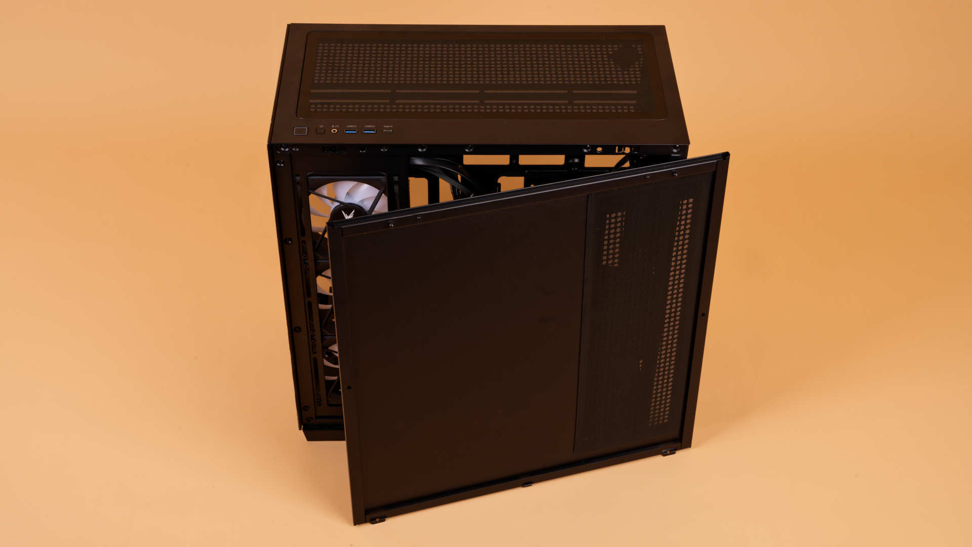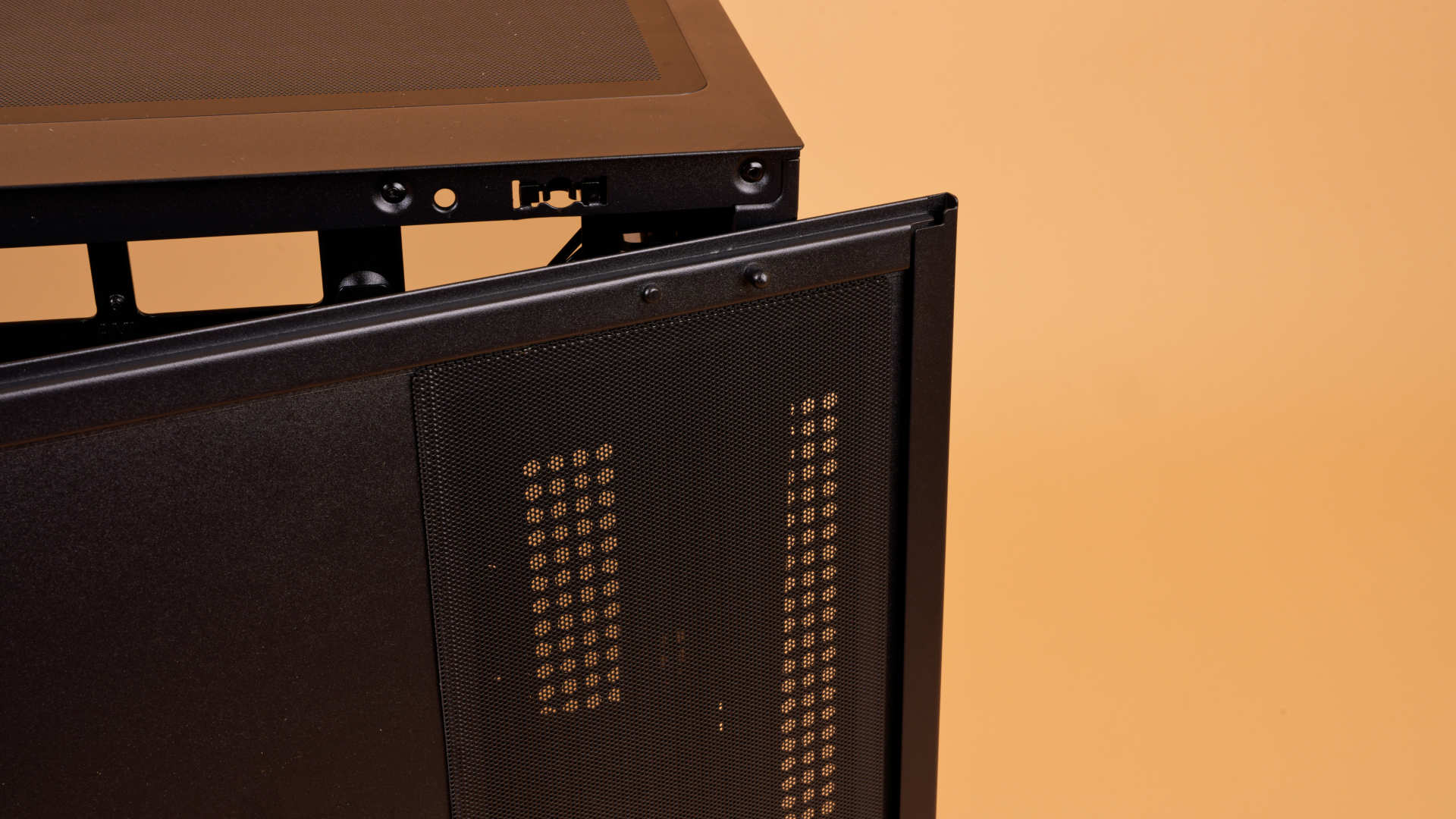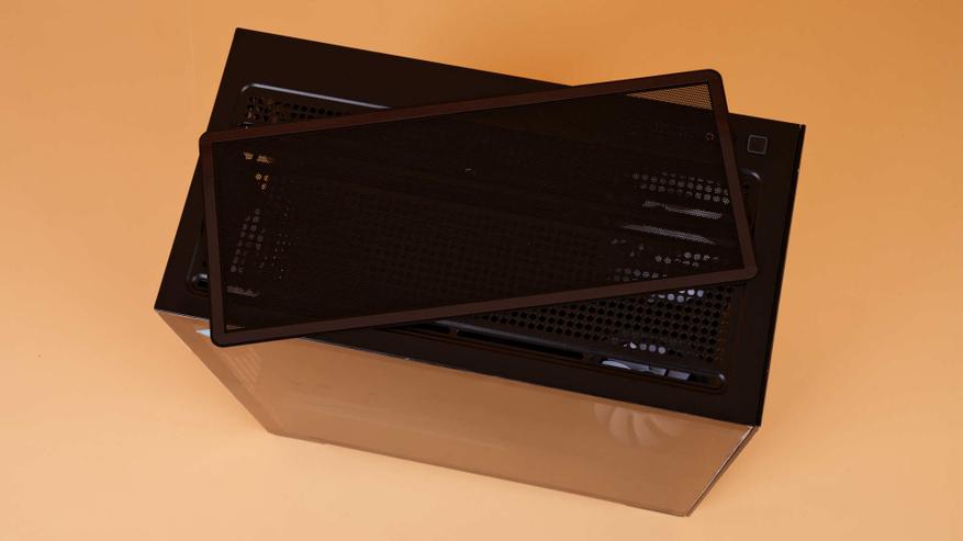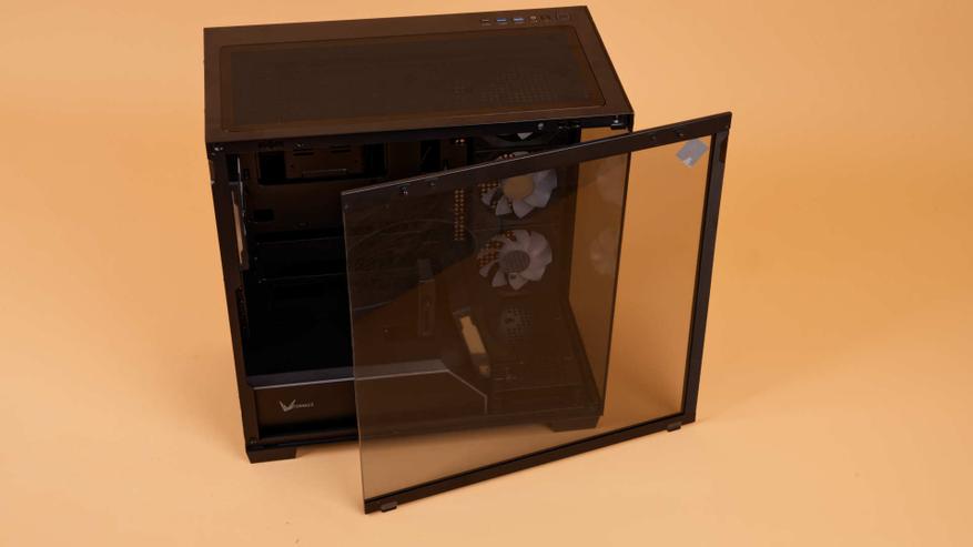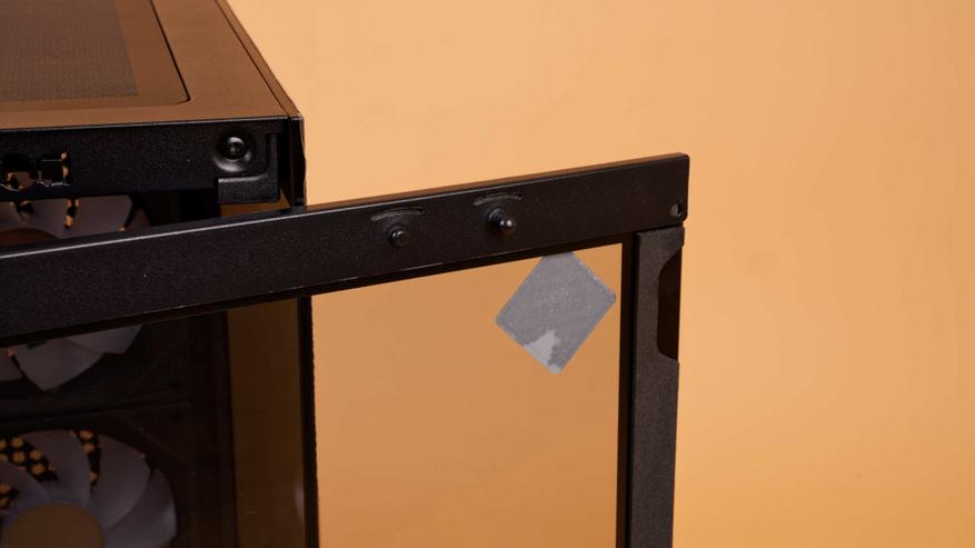 Левая боковая панель, выполненная из того же закалённого стекла, повторяет эстетику передней. Её также обрамляет скрывающий металлические планки чёрный кант. Чтобы снять панель, нужно потянуть её на себя с тыльной стороны корпуса — для этого предусмотрено небольшое углубление, за которое удобно зацепиться пальцем.