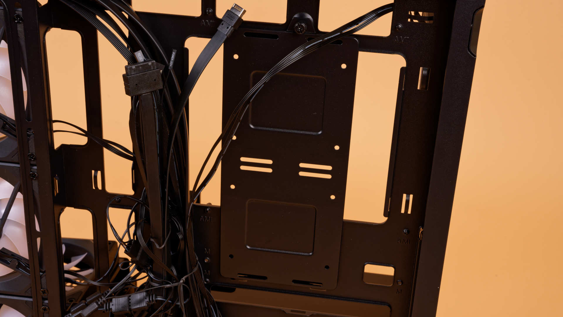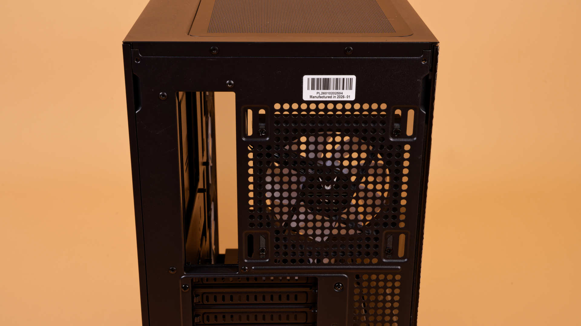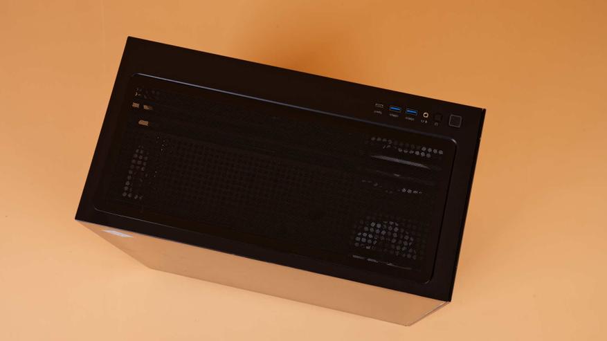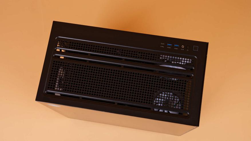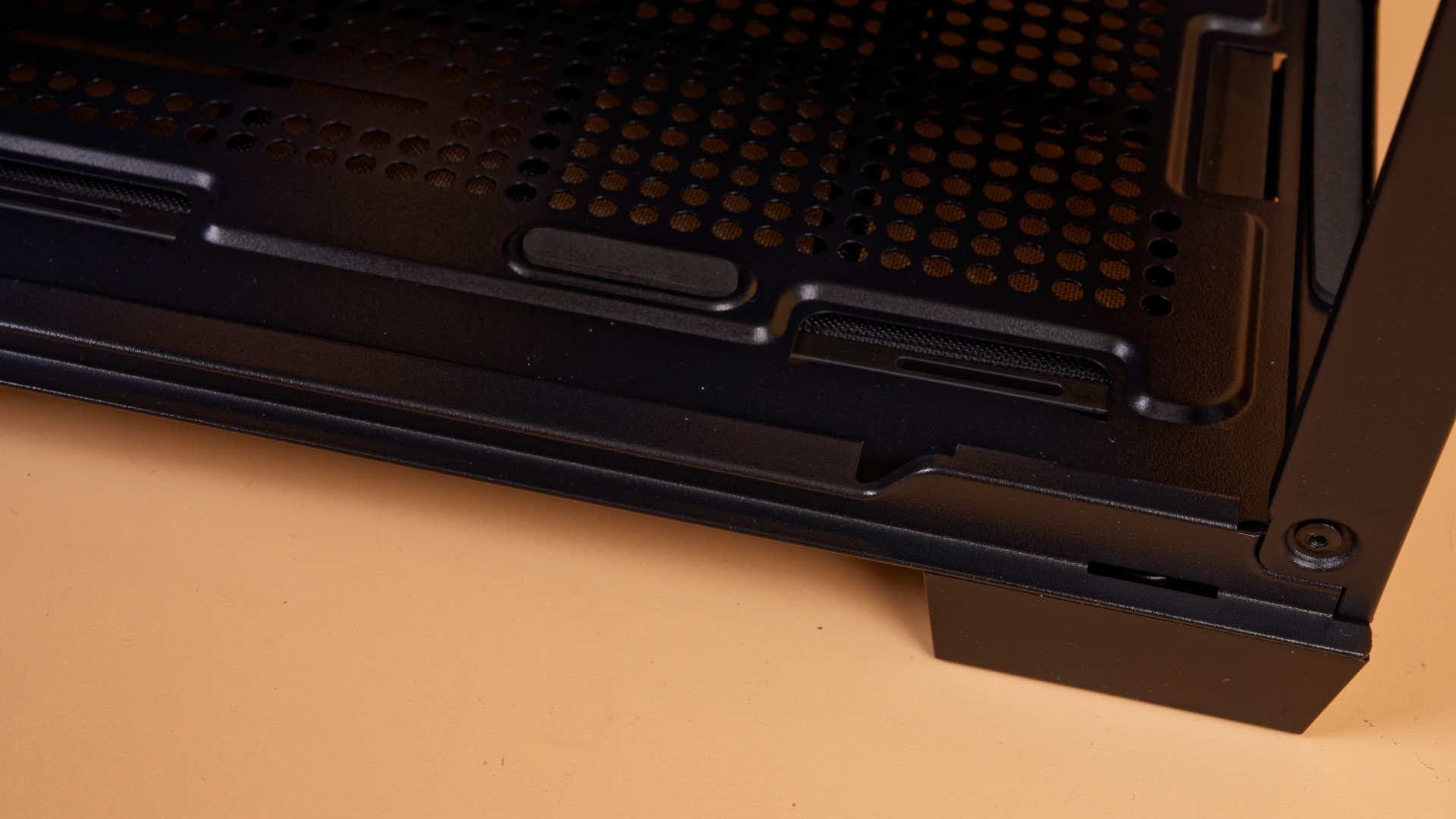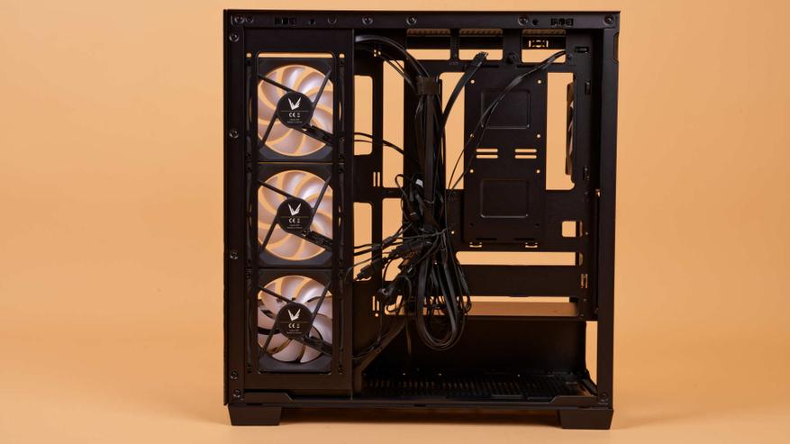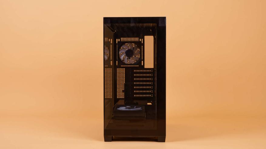 Левая боковая панель, выполненная из того же закалённого стекла, повторяет эстетику передней. Её также обрамляет скрывающий металлические планки чёрный кант. Чтобы снять панель, нужно потянуть её на себя с тыльной стороны корпуса — для этого предусмотрено небольшое углубление, за которое удобно зацепиться пальцем.