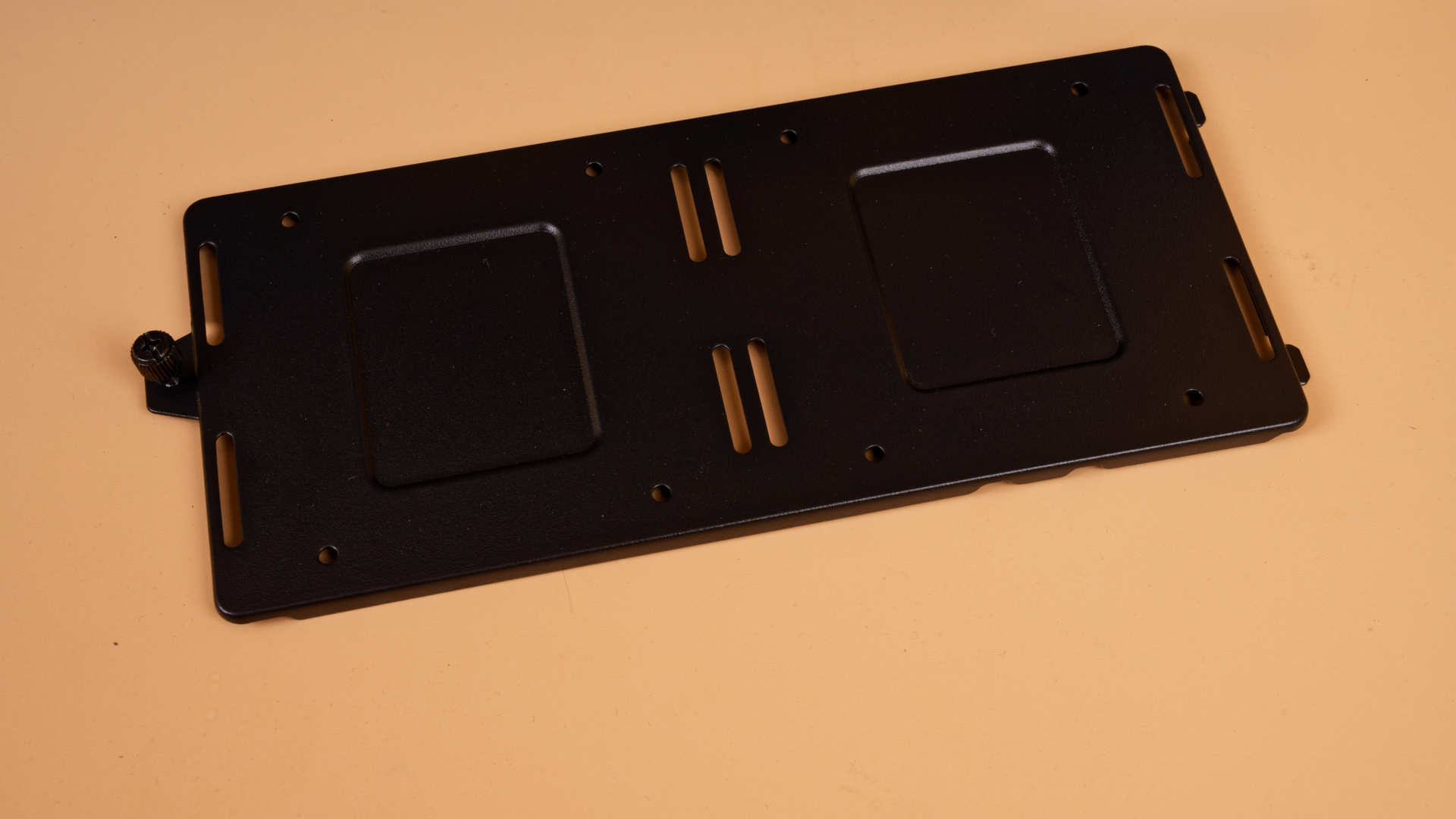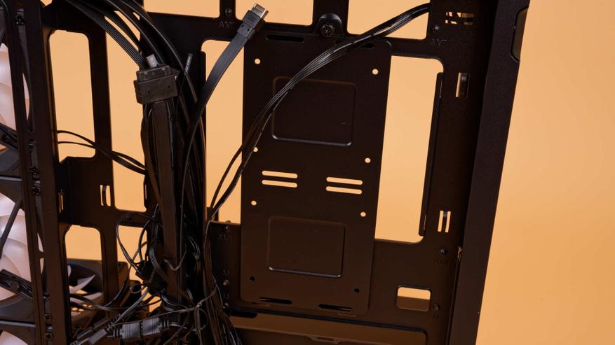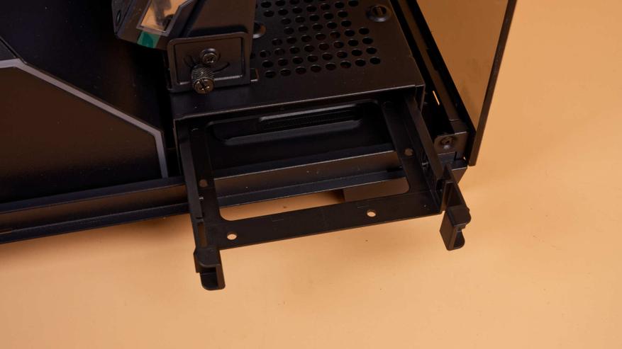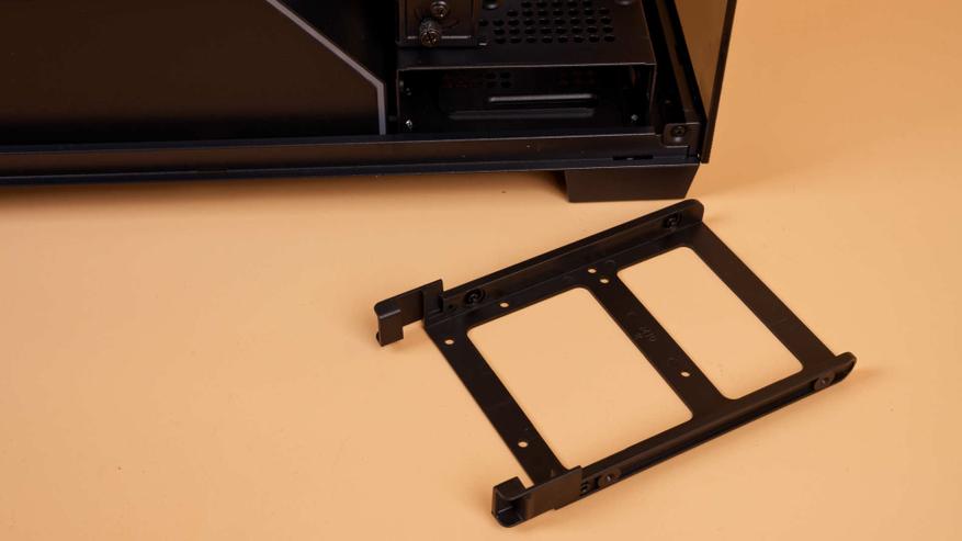 На поддоне для материнской платы закреплена металлическая панель, на которую устанавливаются накопители типоразмера 2,5 дюйма.