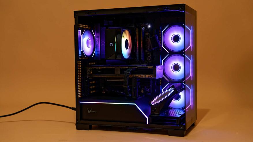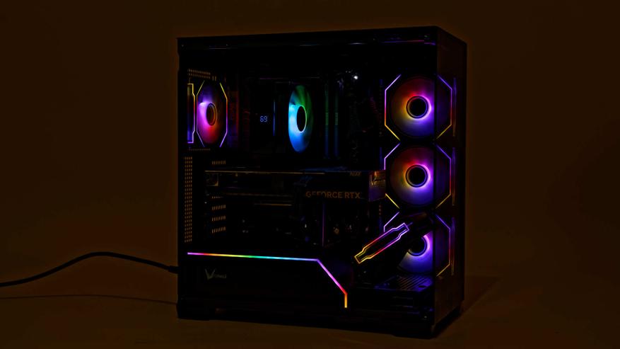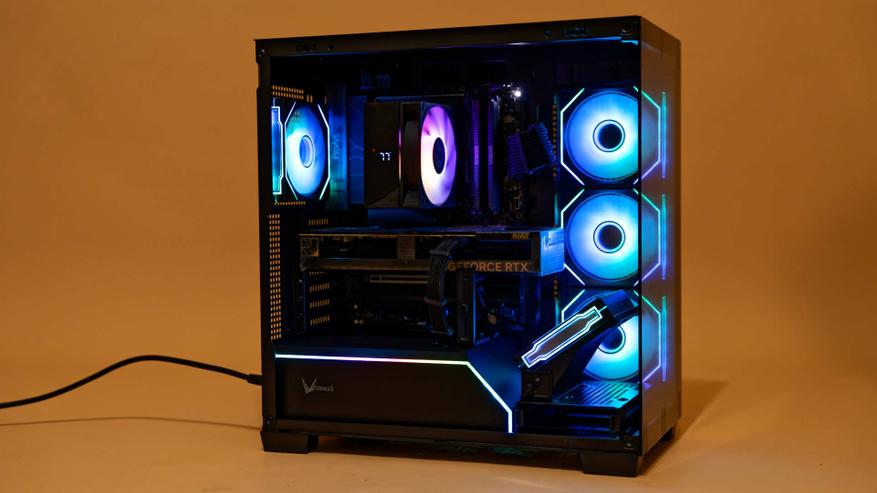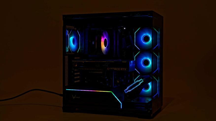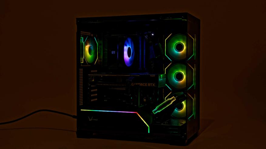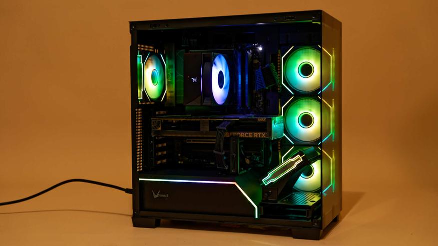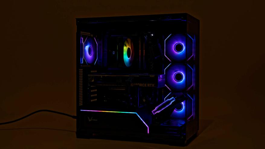 Проблем с проведением сборки в Crystal Z8G Floe не возникнет — это современный корпус с продуманной архитектурой. Что же касается подсветки, то она предусмотрена на вентиляторах и кожухе блока питания. Оценить её предлагаю по фотографиям готовой системы.