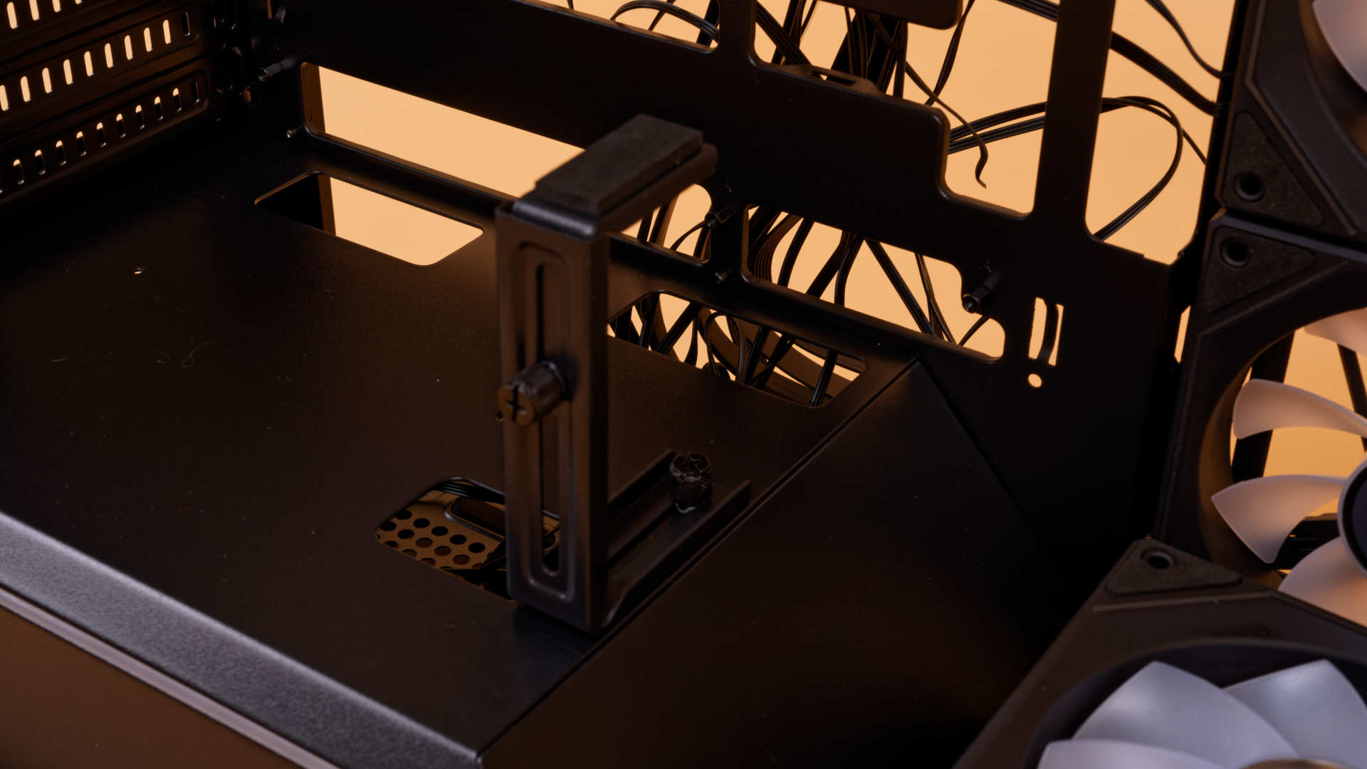 На корпусе блока питания установлен кронштейн с возможностью регулировки по высоте. Данный элемент конструкции предназначен для дополнительной поддержки тяжёлых систем охлаждения видеокарт, выступая в качестве опорной точки. Следует отметить, что максимальная длина видеокарты, совместимая с корпусом, не должна превышать 420 мм.