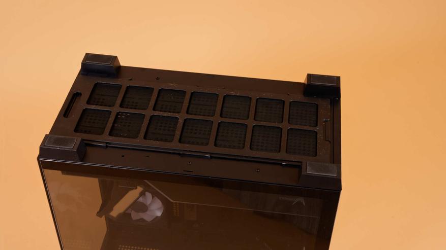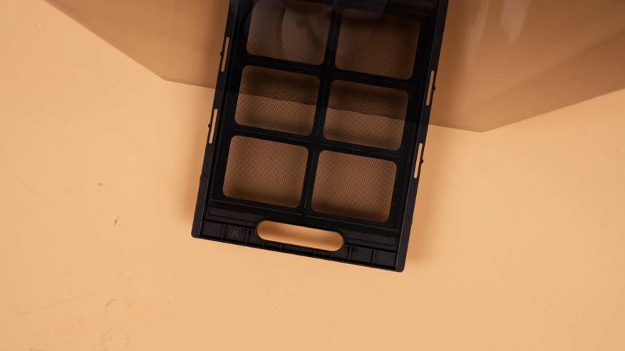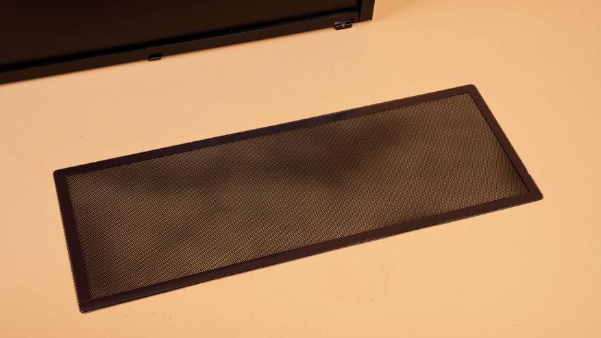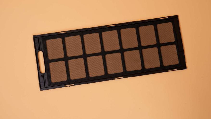Между ними, во всю длину корпуса, находится нейлоновый пылевой фильтр в пластиковой рамке, который выдвигается с фронтальной стороны. Это удобно: даже если корпус стоит вплотную к стене, его не придётся сдвигать, а очистка фильтра займёт всего несколько секунд.